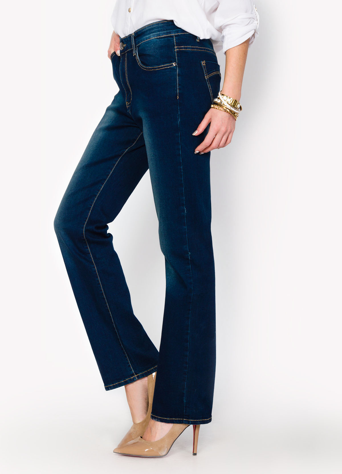 Kobiece ciemne spodnie jeansy z prostymi nogawkami, cieniowane. Wykonane z jeansu o ciekawym granatowym odcieniu, który dobrze łączy się z innymi kolorami, dodatkowo cieniowane nogawki. Tradycyjnie zapinane na zamek i guzik, szlufki w pasie. Kieszenie wsuwane z przodu i z tyłu, wykończone nitami. Szwy wykończone nicią w kontrastowym kolorze.Rozjaśniane jeansy to trend roku i ulubiona pozycja w szafie modnej kobiety. Spodnie na sylwetce prezentują się bardzo atrakcyjnie.Pasują do wszystkiego i są komfortowe w noszeniu. Z modnym zestawem dodatków świetnie sprawdzą się w każdej sytuacji - do codziennego stylu casual, stroju sportowego oraz eleganckich outfitów np. ze szpilkami.Materiał 70% bawełna,25% poliester, 5% elastanModelka wzrost 175cm, na co dzień nosi rozmiar S/M