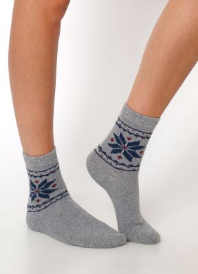Ciepłe skarpetki, wzór skandynawski, elastyczny ściągacz, wzmocnienia na palcach i piętach.Materiał 40% wełna, 30% bawełna, 20% angora, 5% wiskoza, 5% elastan.