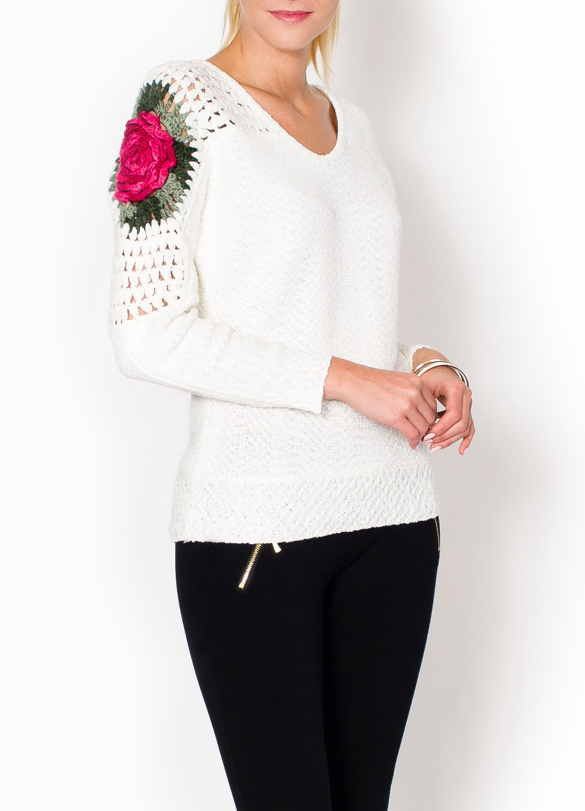 Ciepły damski sweter, odpowiedni na jesienno-zimową porę. Przeplatany połyskującą nitką. Dekolt w serek. Luźniejszy pod pachami. Rękawy długie. Przód i tył gładkie. Na ramieniu kontrastowa i efektowna róża, która ładnie ożywia całość.Chłodniejsza pora to czas na zmianę garderoby. Wygodny pulower z kwiatowym detalem doda stylu każdemu zestawieniu. Modny oversizowy fason i oryginalne wzornictwo swetra czynią go interesującym dodatkiem do jesiennej codziennej stylizacji. Miękkie wykończenie podnosi komfort noszenia.Materiał 60% poliester, 35% akryl, 5% elastanModelka wzrost 175cm, na co dzień nosi rozmiar S/M