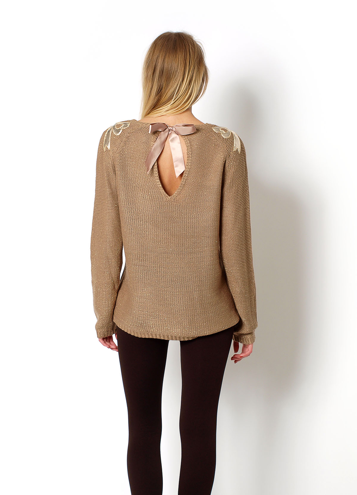 Sweter o luźniejszym fasonie. Dół i rękawy zakończone ściągaczem. Na ramionach naszyte kokardy. Całość przepleciona błyszczącą nicią. Tył wiązany. Materiał: 90% akryl, 10% poliester.Modelka: wzrost 175 cm, na co dzień nosi S/M.