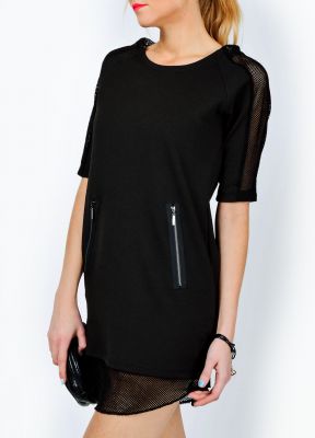 Czarna, elegancka sukienka/tunika, wzdłuż rękawów i na dole wstawki z siateczki, z przodu ozdoba w postaci zamków, które imitują kieszenie. Ciekawa struktura materiału.Materiał 95% poliester, 5% elastan.Modelka wzrost 172cm, na co dzień nosi S/M, rozmiar z prezentacji produktu S/M