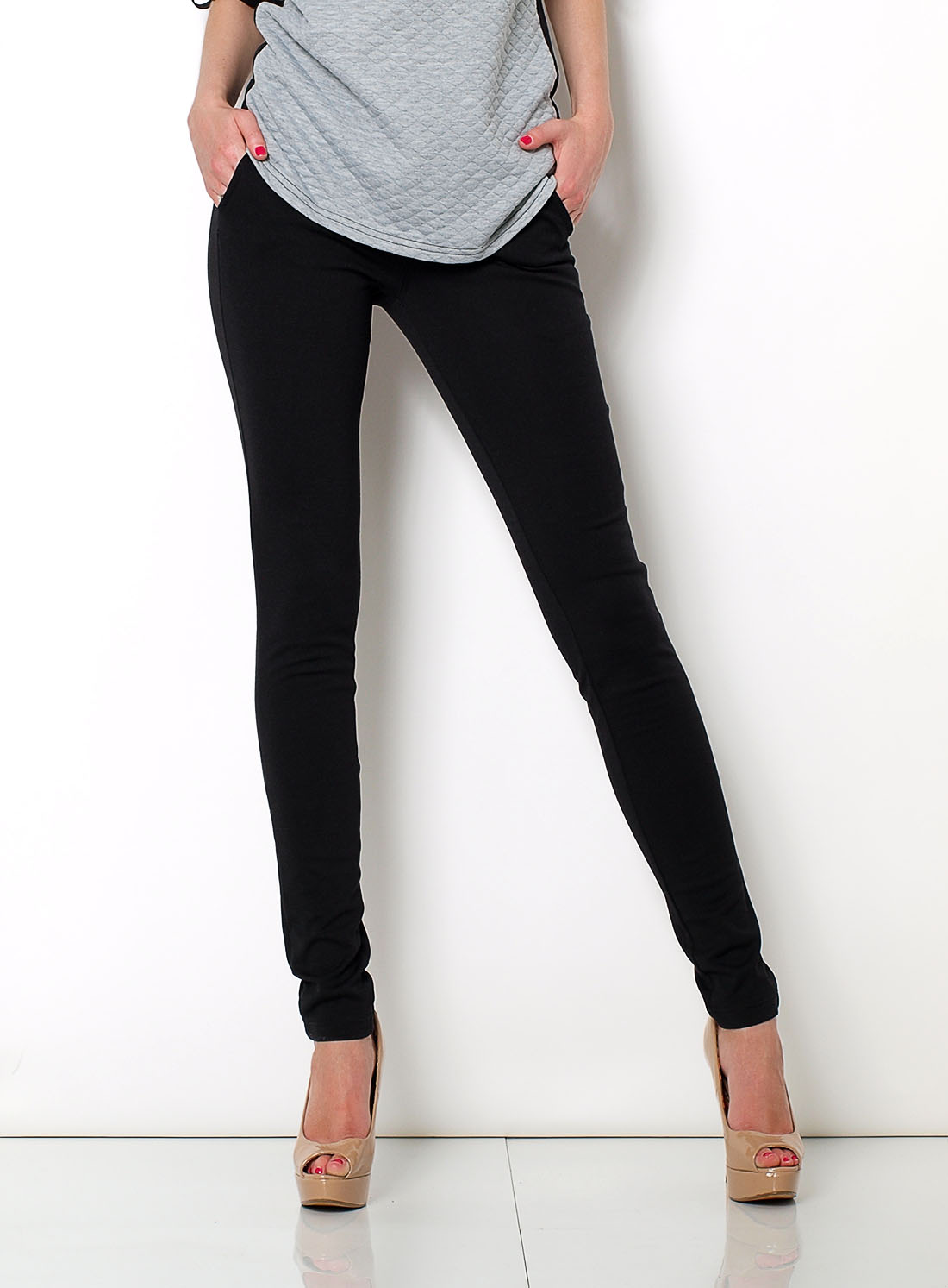 Czarne eleganckie spodnie, wstawki z ekoskóry przy kieszeniach z przodu i z tyłu oraz w pasie, z przodu kieszenie, z tyłu imitacja kieszeni.Materiał 70% bawełna, 20% poliester, 10% elastan.Modelka wzrost 175cm, na co dzień nosi S, rozmiar z prezentacji produktu M