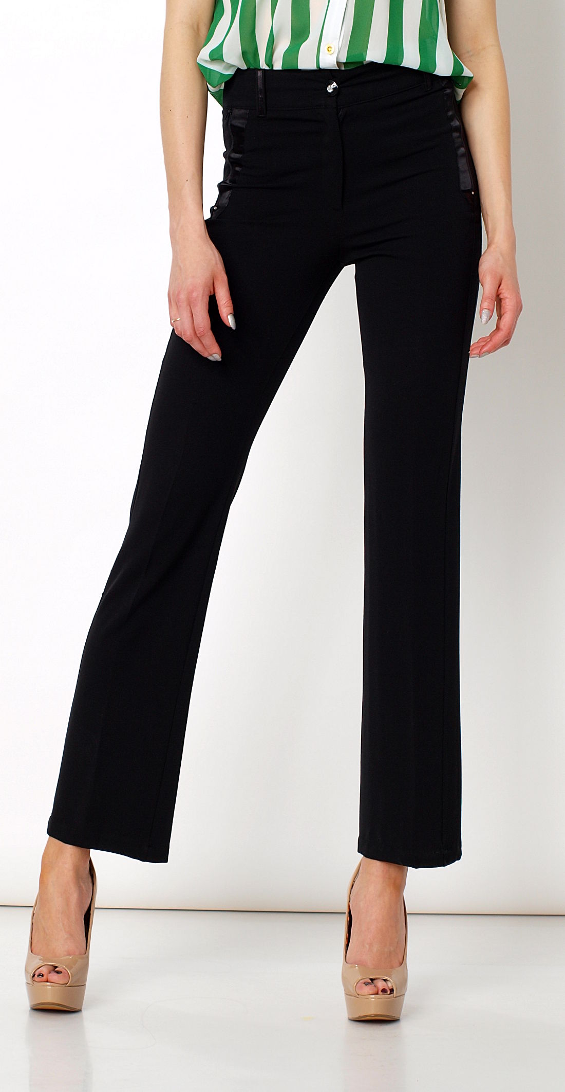 Eleganckie spodnie z lekko rozszerzaną nogawką. Czarne cygaretki z wyższym stanem, o klasycznym kroju. Zapinane na zamek i ozdobny guziczek. W pasie szlufki, dzięki czemu można je nosić z paskiem. Z przodu wstawki z połyskującego materiału oraz zamki, które imitują kieszenie. Spodnie wykonane są z porządnego materiału, dobrego gatunkowo. Świetnie sprawdzą się w eleganckich, wymagających formalnego charakteru stylizacjach. Skład: 65% bawełna, 35% poliester.Wzrost modelki: 172cmModelka ma na sobie: rozmiar z metki LNa co dzień nosi rozmiar: S/M