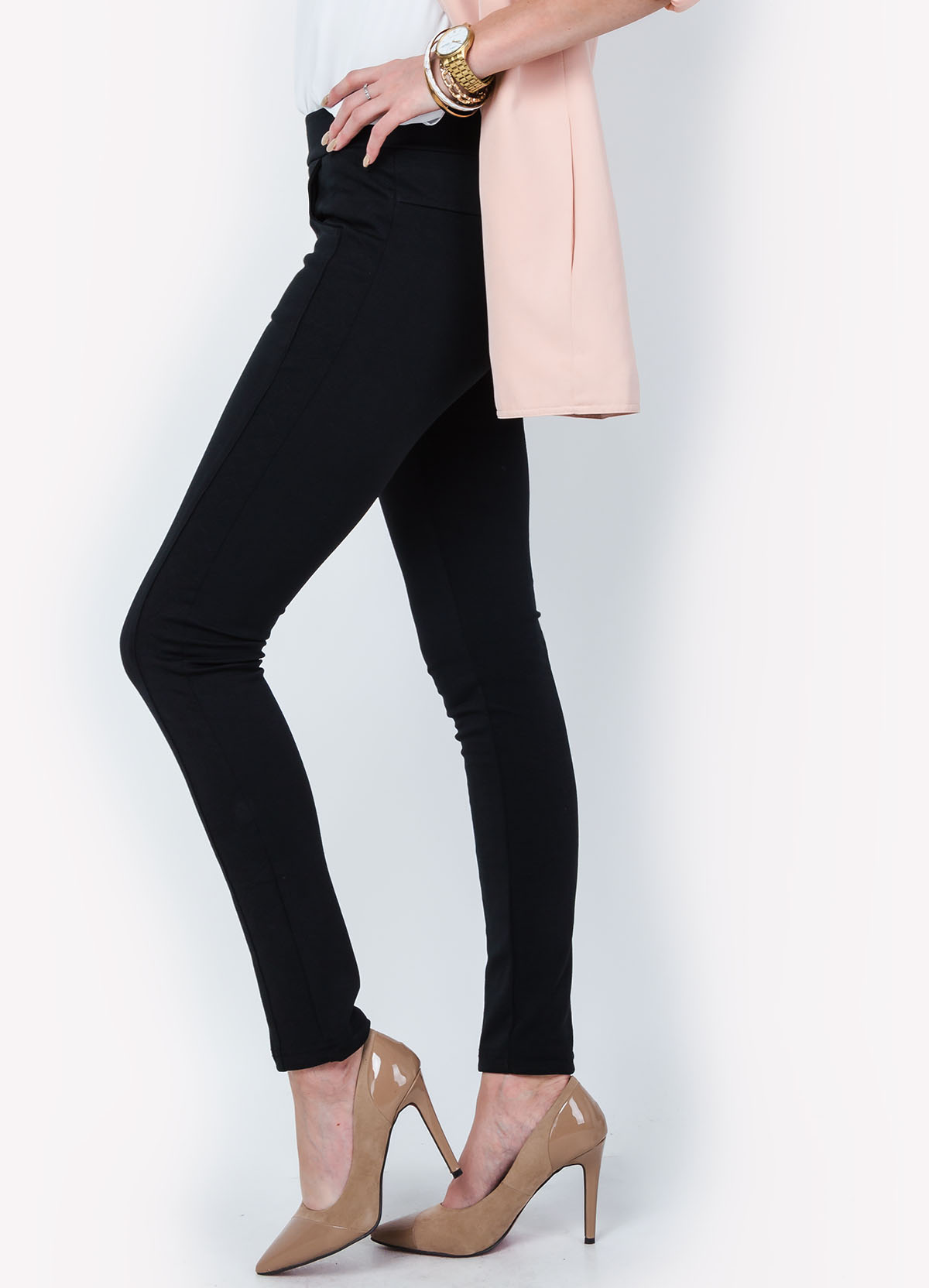 Czarne rurki/legginsy, w pasie gruba gumka, z przodu wsuwane kieszenie, po bokach wzdłuż nogawek lampasy z ozdobnym przeszyciem. Modny pikowany pas po bokach nogawek i podwyższony stan. Bardzo wygodne, rozciągliwe.Materiał 65% bawełna, 35% poliester.Modelka wzrost 175cm, na co dzień nosi S/M