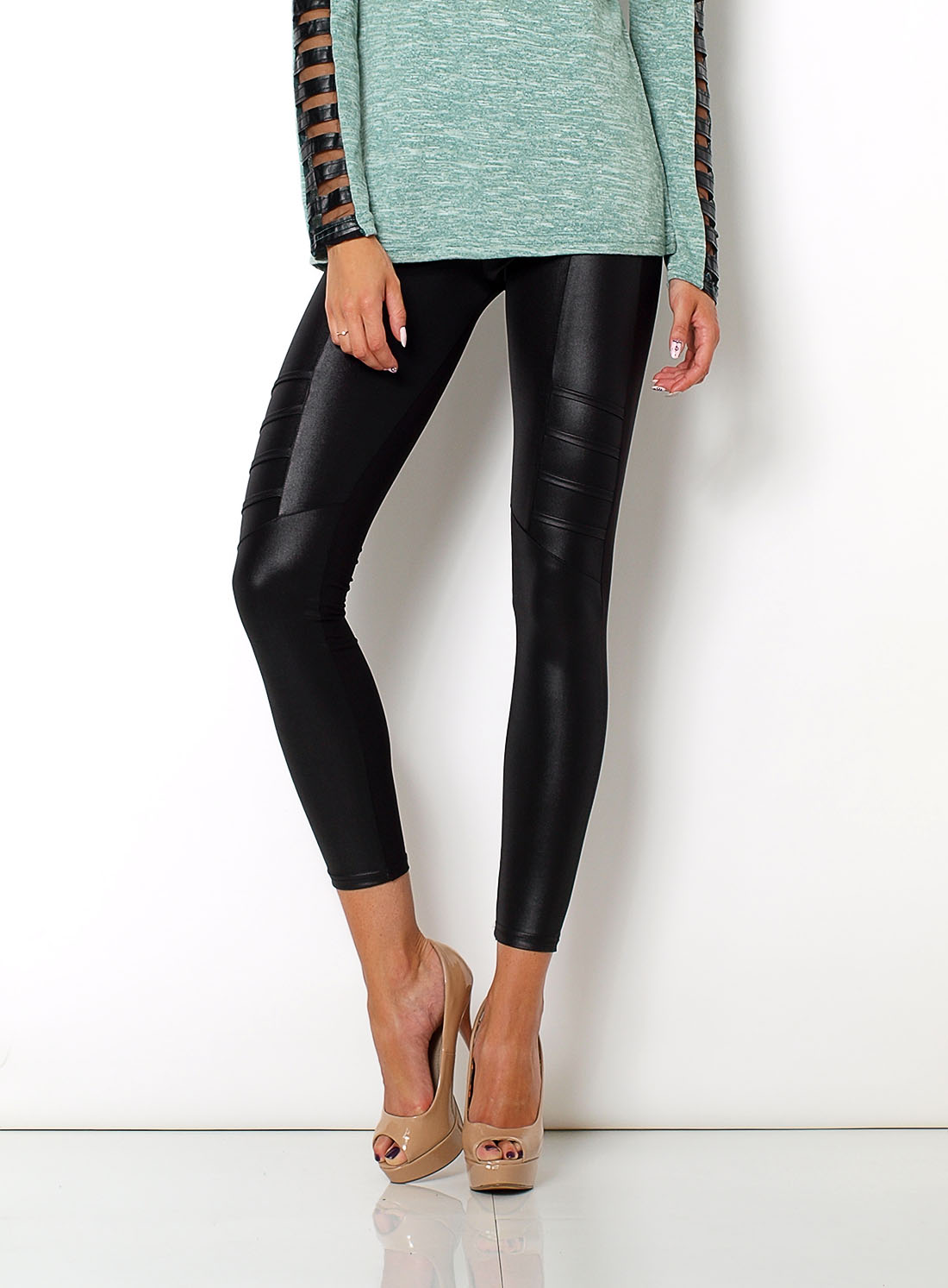 Czarne legginsy, połączanie dwóch materiałów, z przodu a'la skóra, lekko połyskująca z przeszyciami, z tyłu materiał gładki i matowy, w pasie gumka.Materiał 85% poliester, 10% bawełna, 5% elastan.Modelka wzrost 172cm, na co dzień nosi S/M, rozmiar z prezentacji produktu M/L