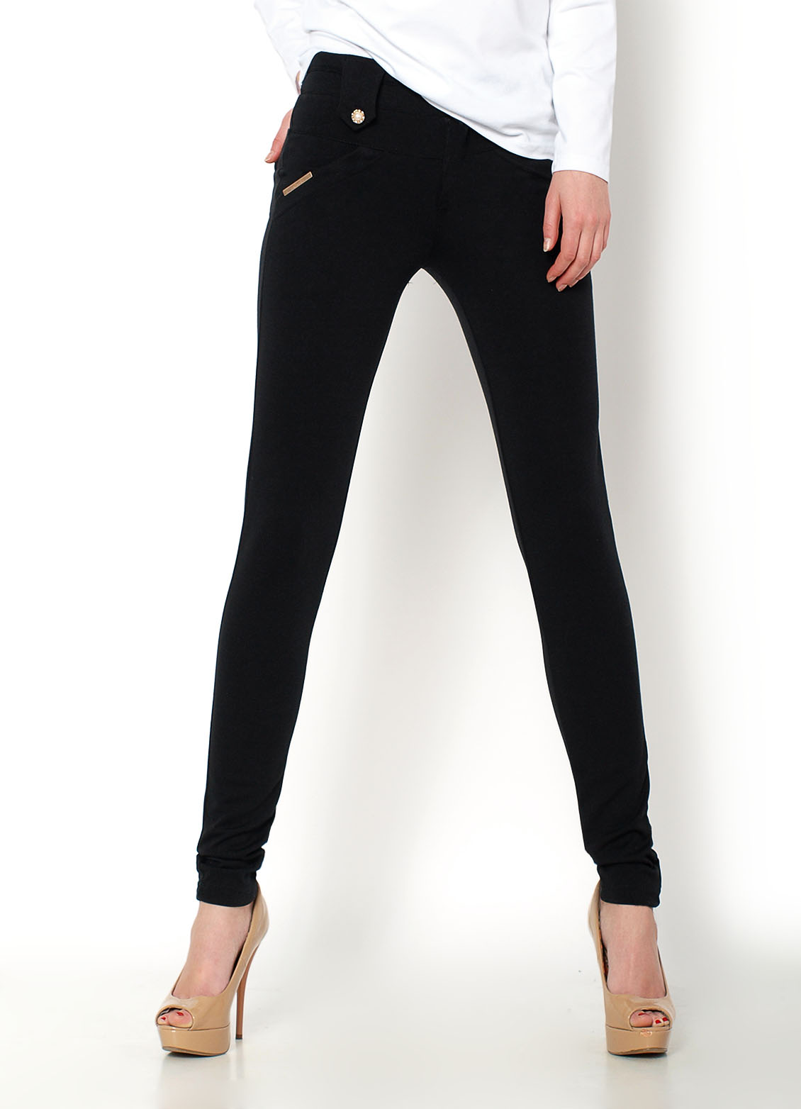 Spodnie czarne, fason rurki, zapinane na zamek i guzik, w pasie szlufki wykończone butonami, kieszenie wsuwane, z przodu kieszenie ozdobione złotą blaszką.Materiał 65% bawełna, 30% poliester, 5% elastan.Modelka wzrost 175cm, na co dzień nosi S/M, rozmiar z prezentacji produktu M