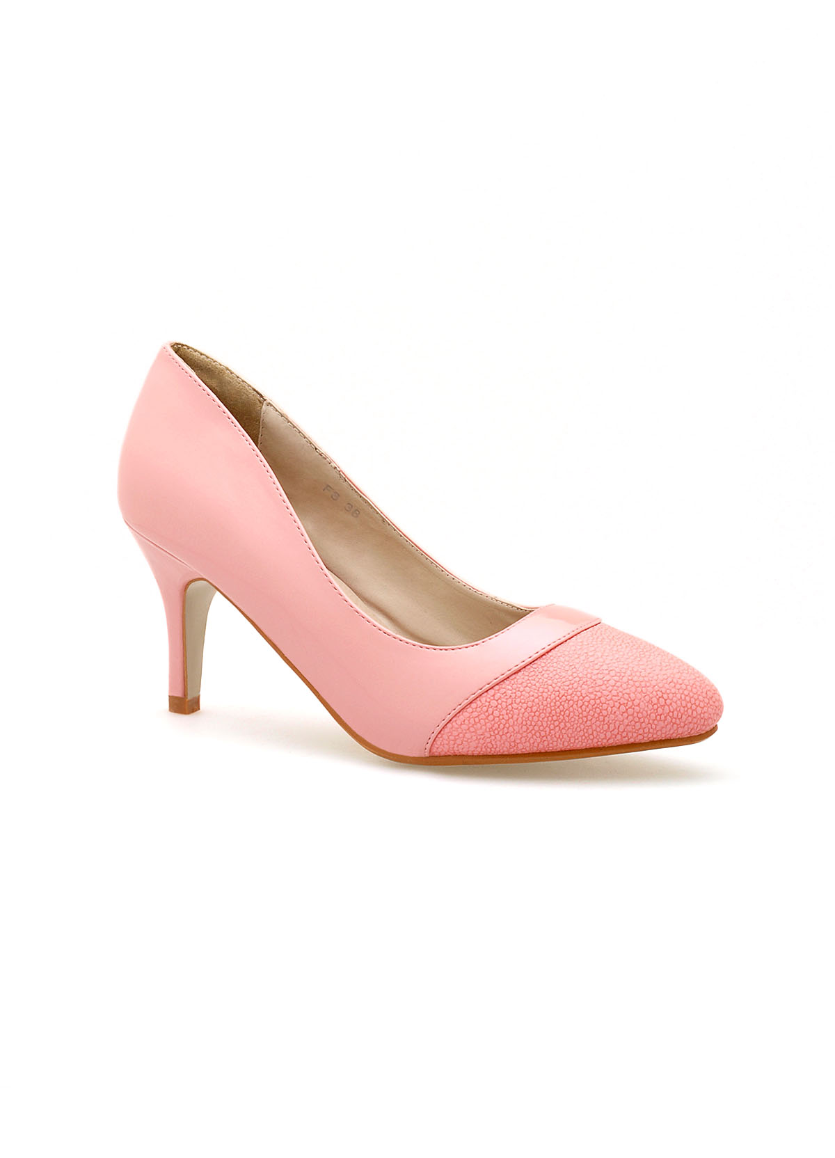 Damskie lakierowane szpilki na nie wielkim obcasie.Noski są matowe subtelnie wykończone brokatem z wytłaczanym wzorem.Buty są bardzo wygodne i pięknie prezentują się na stopie.Dostępne są w odcieniu pudrowego różu,który jest hitem w tym sezonie.