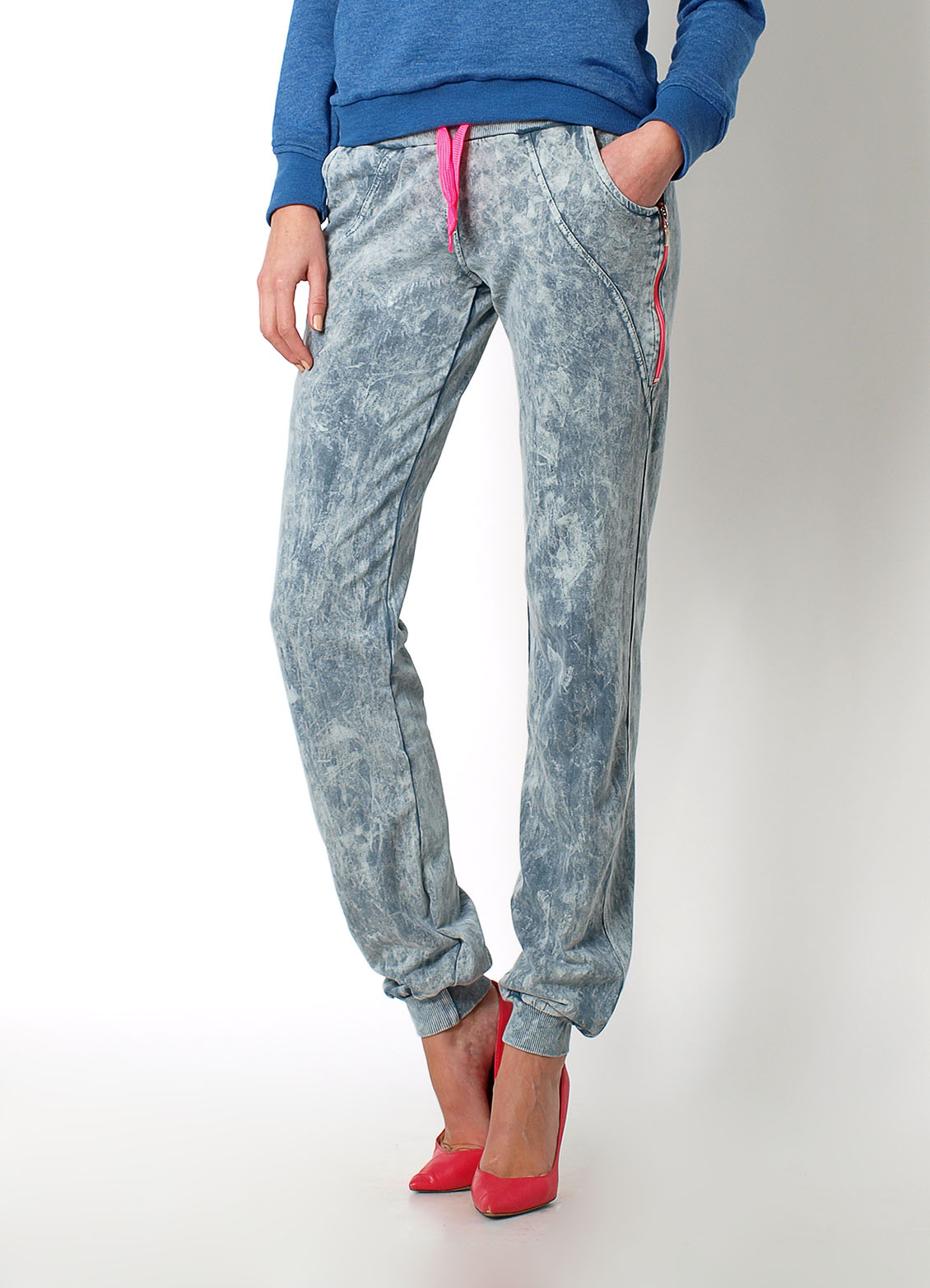 Spodnie dresowe dekatyzowane, nogawki zakończone ściągaczami, w pasie gumka i sznurek do regulacji , sznurek w kontrastowym kolorze, z przodu kieszenie wsuwane, bo bokach kieszenie z zamkiem w kontrastowym kolorze. Odcienie oraz wzór spodnie mogą nieznacznie się różnić od prezentowanych na zdjęciach.Materiał90% wiskoza, 10% elastan.Modelka wzrost 175cm, na co dzień nosi S/M, rozmiar z prezentacji produktu M