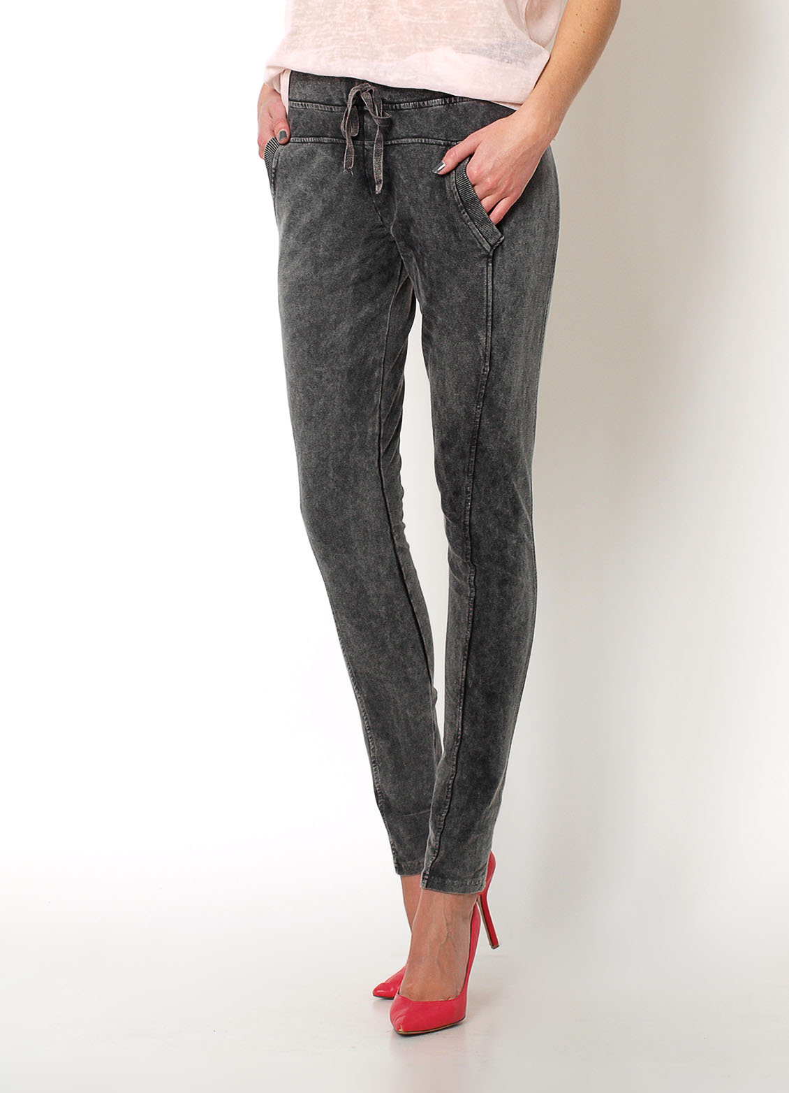 Dekatyzowane spodnie dresowe, imitacja jeans, w pasie gumka i sznurek do regulacji, z przodu kieszenie, pionowe przeszycia na nogawkachMateriał wzrost 175cm, na co dzień nosi S/M, rozmiar z prezentacji produktu M