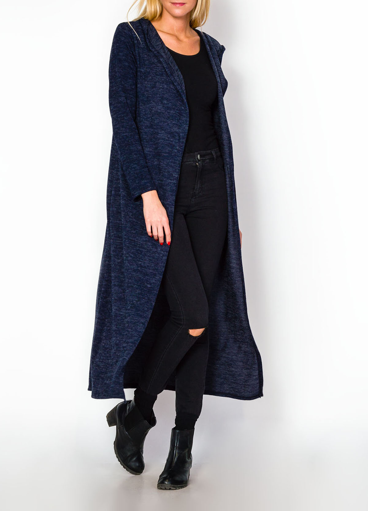 Kardigan w wersji maxi - długi sweter, niemal do samych kostek. Wykonany z miękkiej w dotyku melanżowej dzianiny. Kaptur, długie rękawy oraz wsuwane kieszenie z przodu. Dostępny w kolorze granatowym. Produkt włoski dobrej jakości.Długa, efektowna, niesamowicie komfortowa narzutka maxi long - modne dopełnienie codziennego stroju. Uniwersalny kolor i klasyczny długi krój pasuje niemal do wszystkiego - jako narzutka na eleganckie sukienki, czy w stylu sportowym do jeansów i trampek.Materiał 95% wiskoza, 5% elastan.Modelka wzrost 175cm, na co dzień nosi rozmiar S/M