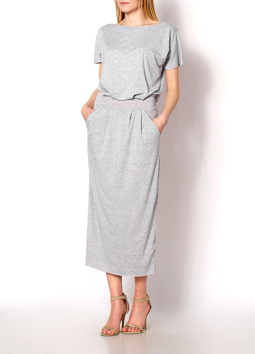 Sukienka z krótkimi rękawami. Kieszenie z boku, zawiązywana z tyłu w pasie. Luźniejsza góra, zwężana ku dołowi. Dekolt łódka, surowe wykończenie. Zakładki na biodrach ładnie je podkreślają. Lekki dresowy materiał.Materiał35% bawełna, 65% poliester.Modelkawzrost 175 cm, na co dzień nosi rozmiar S/M, rozmiar z prezentacji produktu M