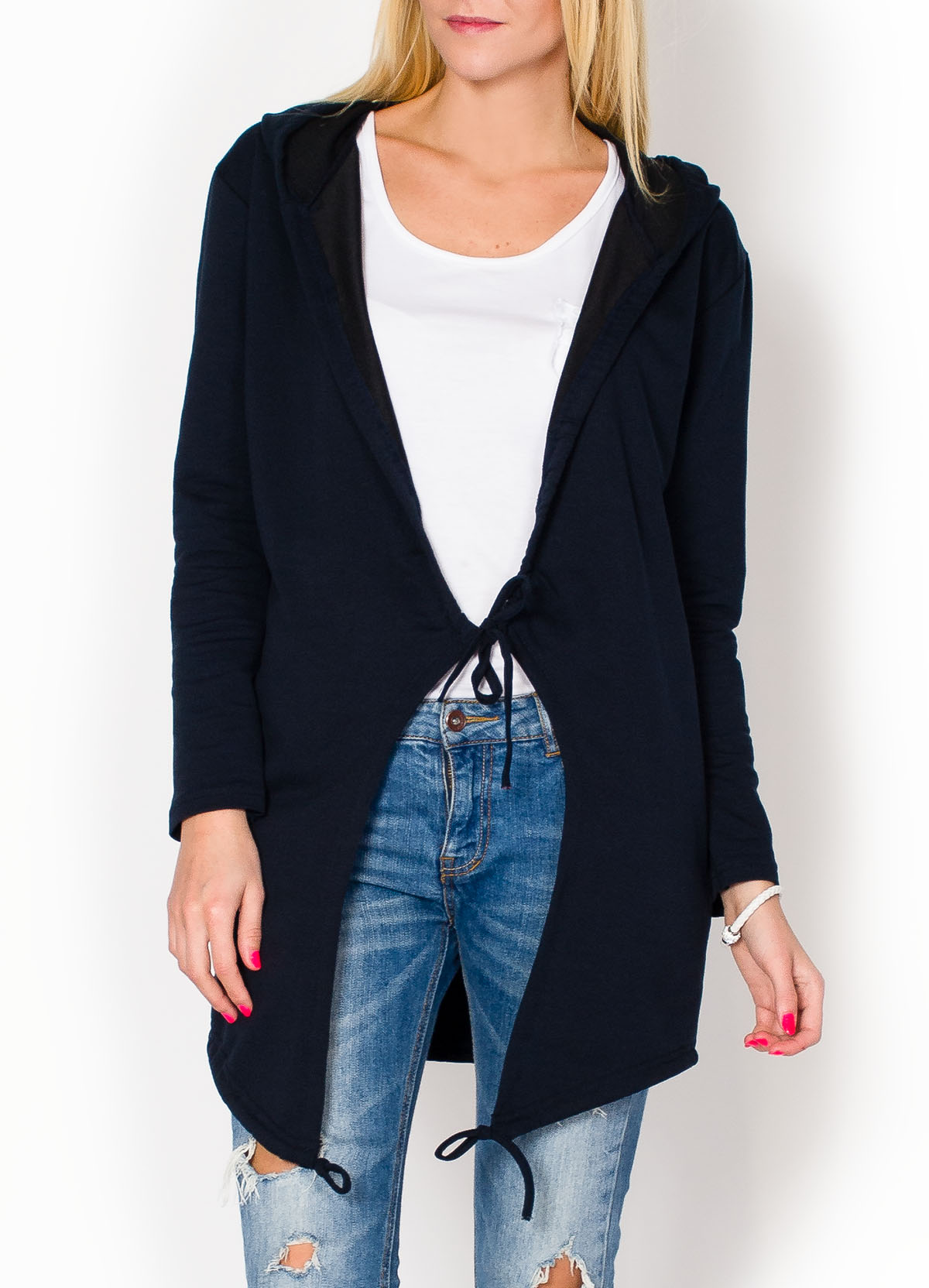 Dresowy kardigan, oryginalny dłuższy krój z kapturem. Wiązana w pasie, przód dłuższy niż tył. Poły oraz dół ściągane sznureczkiem, pozwalające na dowolne formowanie kształtu i długość bluzy. Wykonana z doskonałej jakości materiału, który ładnie układa się na sylwetce.Oversizowe dresowe narzutki to hit tegorocznej jesieni. Doskonale dopełnią każdy codzienny outfit, świetnie się prezentują np. z jeansami i są bardzo wygodne. Produkt turecki świetnej jakości. Materiał 50% bawełna, 45% poliester, 5% elastanModelka wzrost 175cm, na co dzień nosi rozmiar S/M