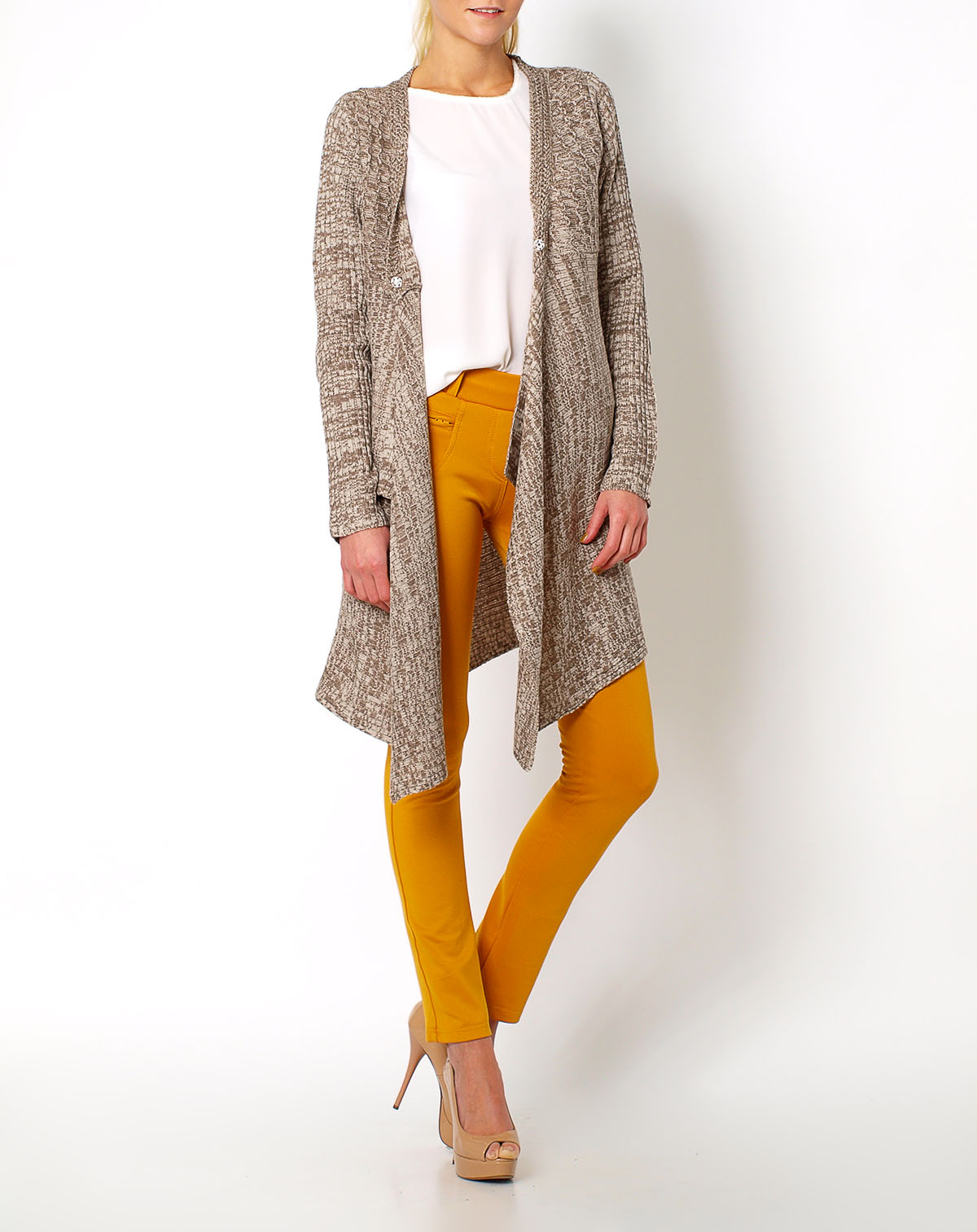 Długi kardigan/sweter, melanżowy, fason waterfall, zapinany na guzik, asymetryczny, przód dłuższy. Materiał 20% bawełna, 80% akryl (sztuczna wełna)Modelka wzrost 175cm, na co dzień nosi S/M, rozmiar z prezentacji produktu S/M.