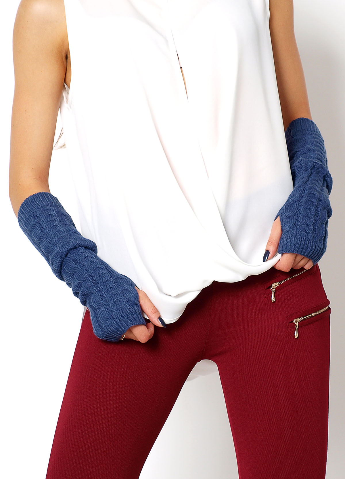 Długie rękawiczki bez palców (z oddzielnym otworem na kciuk). Wygodne mitenki zdobione delikatnie wypukłymi warkoczami. Ciepły otulacz na ręce, chroniący dłonie i przedramiona przed zimnem i mrozem. Zakończone ściągaczem, dzięki czemu dobrze się dopasowują i trzymają na ręce.Skład: 100% akryl