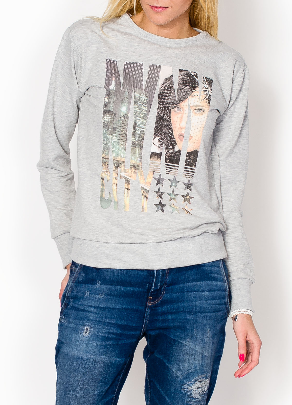 Praktyczna damska bluza dresowa z printem NYC, gwiazdami i twarzą. Dekolt okrągły. Rękawy i dół wykończone ściągaczem. Wykonana z materiału dobrego gatunkowo, przyjemnego dla ciała.Idealny wybór na co dzień i modną stylizację w miejskim stylu. Wygody, luźny fason zapewnia komfort i swobodę ruchów. Nadruki na ubraniach stanowią jeden z ważnych trendów w codziennej garderobie - wyglądaj modnie i czuj się wygodnie. Produkt turecki świetnej jakości.Modelka wzrost 175cm, na co dzień nosi rozmiar S/M