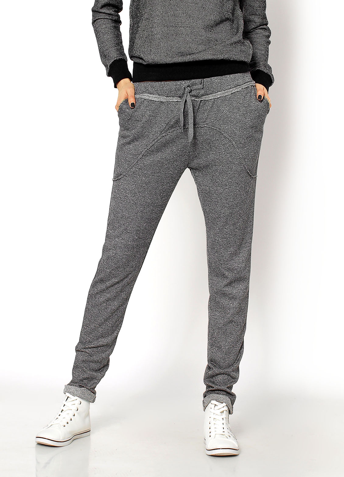 Spodnie w odcieniach szarości, obniżonym krokiem. W pasie na gumce, dodatkowo sznurek do regulacji. Na przodzie kieszenie, z tyłu ich imitacje. Nogawki lekko zwężane. Materiał: 65% bawełna, 35% poliester. Modelka: wzrost 175 cm, na co dzień nosi S/M, rozmiar z prezentacji produktu S.