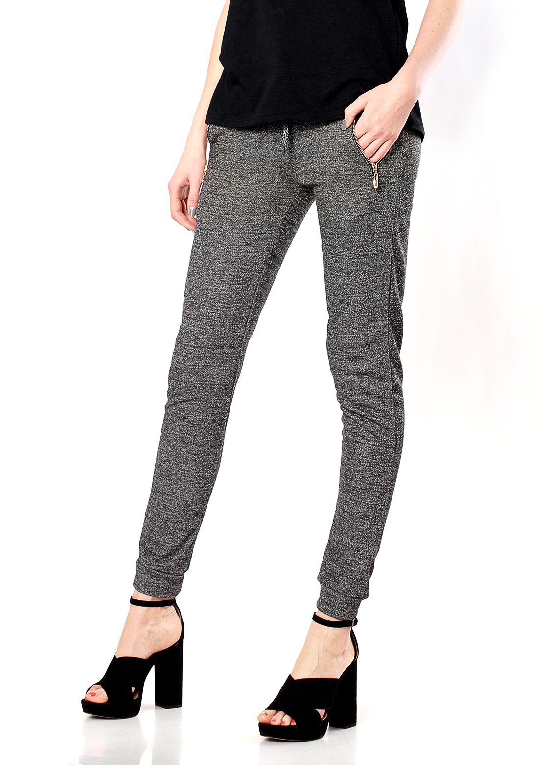 Spodnie dresowe na gumce w pasie, dodatkowo sznurek do regulacji. Nogawki zwężane, zakończone ściągaczem. Na przodzie zapinane kieszenie. Materiał: 65% bawełna, 30% poliester, 5% elastan.Modelka: wzrost 175 cm, na co dzień nosi S/M, rozmiar z prezentacji produktu S.