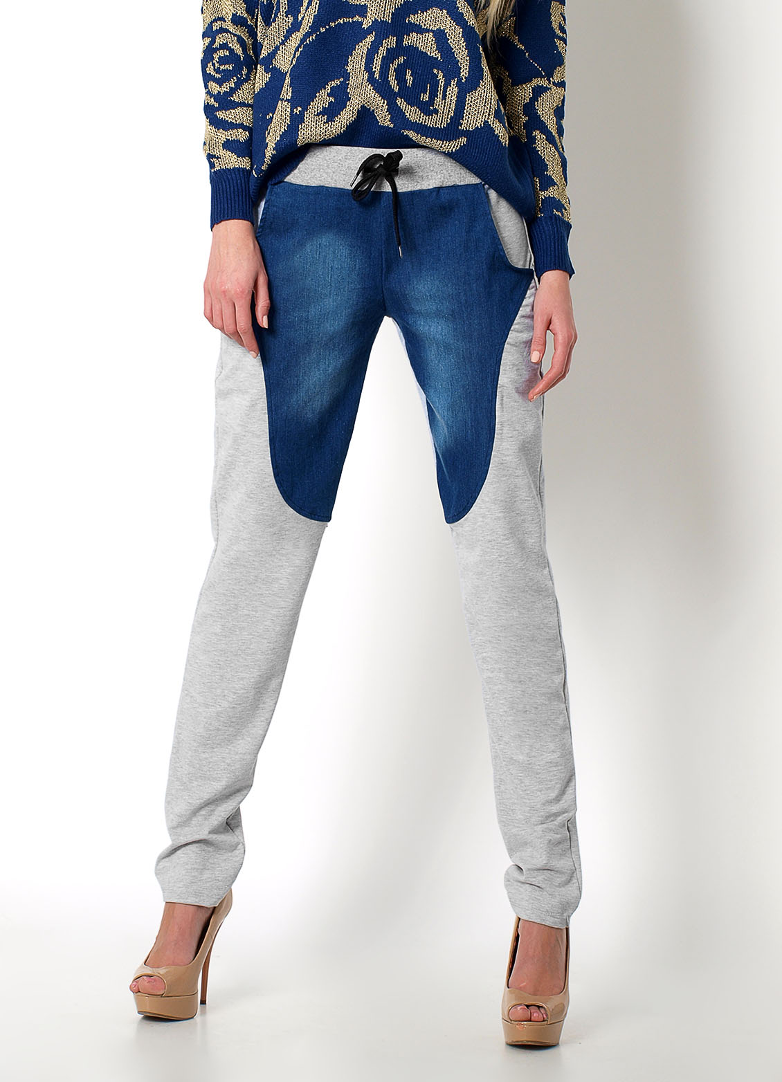 Spodnie dresowe z jeansową wstawką, zwężane nogawki, w pasie gumka i sznurek do regulacji, z przodu i z tyłu kieszenie.Materiał 90% bawełna, 10% elastan.Modelka wzrost 175cm, na co dzień nosi S/M, rozmiar z prezentacji produktu M