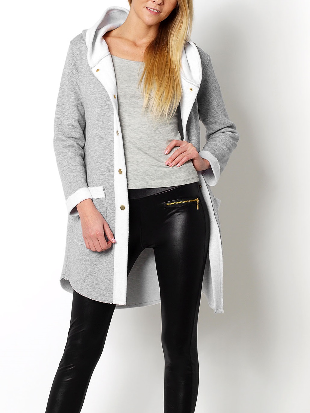 Narzutka z kapturem., zapinana na guziki. Długa bluza z kontrastowymi elementami. Wewnątrz ocieplona polarem. Na przodzie praktyczne kieszenie, dół surowo wykończony.