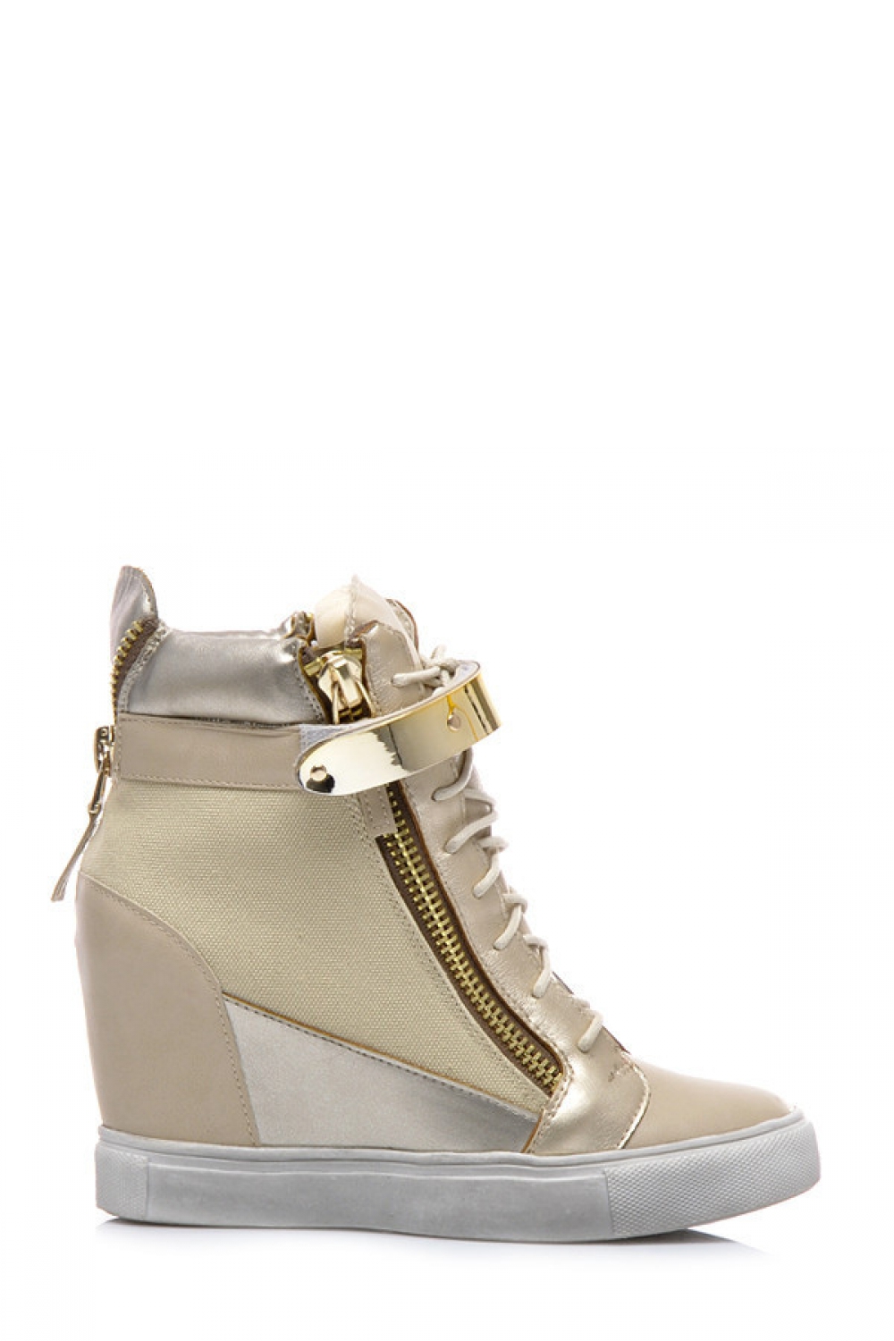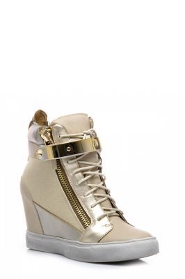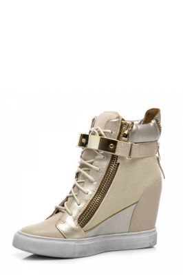 ROZMIARY363738394041DŁ.WKŁADKI(CM)2424,52525,52626,5 Fenomenalne trampki damskie na koturnie.Solidnie wykonane z dbałością o najmniejsze detale.Stylizowane na popularne trampki Giuseppe Zanotti.Idealne dla zwolenniczek wygody i modnego stylu.Wierzchnia cześć wykonana z miękkiego materiału skóropodobnego z oryginalnymi wstawkami materiałowymi.Pełna regulacja tęgości: sznurowanie, rzep i suwaki.Na pasku ozdobne, metalowe złocenie.Trampki stanowią połączenie wygody, komfotu i najnowszych trendów.Gumowa podeszwa posiada właściwości antypoślizgowe.Koturna: 7cmWysokość cholewki: 12-13cm (zależy od rozm.)Materiał: skóra ekologiczna