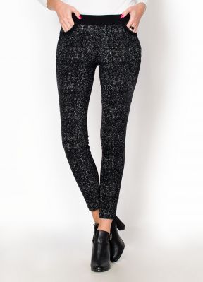 Dopasowane wzorzyste spodnie ze zwężana nogawką. W pasie na gumce. Z przodu wsuwane kieszenie. Na pośladkach ozdobne zameczki. Elastyczny materiał, idealnie dopasuje się do figury, atrakcyjnie podkreślając jej atuty. Są komfortowe niemal jak legginsy.Noszone na co dzień do t-shirtu, czy eleganckiej bluzki, zawsze sprawiają, ze sylwetka prezentuje się rewelacyjnie.Materiał 95% bawełna, 5% elastanModelka wzrost 175cm, na co dzień nosi rozmiar S/M
