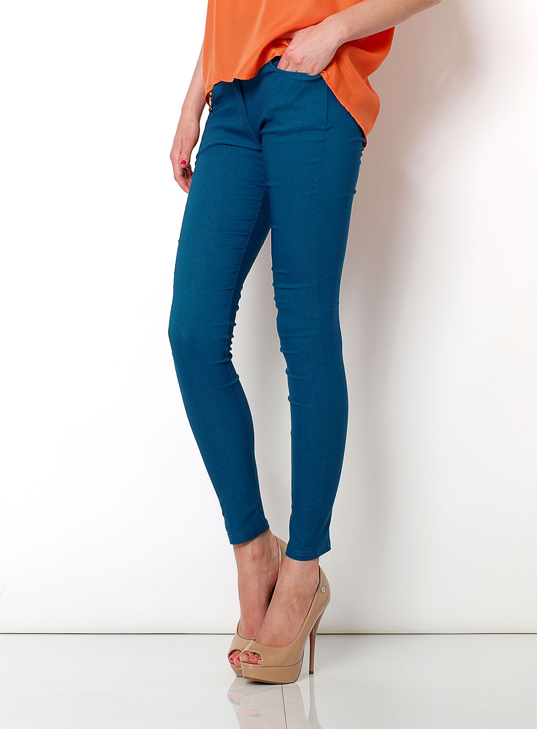 Spodnie z elastycznego materiału, wysoki stan, z tyłu kieszenie bez zdobień, z przodu kieszenie otwarte i zamykane na złoty zamek, szeroki pas zapinany na trzy złote butony .Materiał 95% bawełna, 5% elastan.Modelka wzrost 175cm, na co dzień nosi S, rozmiar z prezentacji produktu M