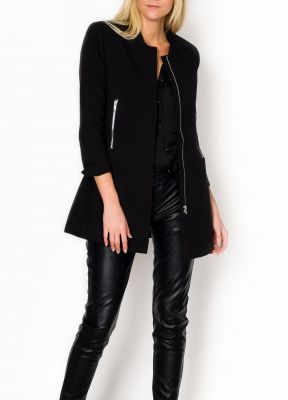 Elegancki długi żakiet przypominający płaszczyk o nowoczesnym, minimalistycznym fasonie. Materiał świetny gatunkowo. Zapinany na kryty zamek w kolorze srebrnym. Z przodu kieszenie wykończone suwakiem, po bokach wsuwane. Rękawki o długości 3/4 z możliwością podwinięcia. Dekolt okrągły. Wewnątrz w całości na podszewce. Na ramionach wszyte poduszki podkreślające kształt sylwetki.Praktyczna część garderoby dla ceniących elegancję i perfekcyjny wygląd. Stylowy, uniwersalny model, który sprawdzi się w eleganckich stylizacjach i codziennych, casualowych zestawieniach. Można go nosić jak zwykły żakiet, jak i okrycie wierzchnie.Materiał 95% poliester, 5% elandex (elastan + spandex)Modelka wzrost 175cm, na co dzień nosi rozmiar S/M