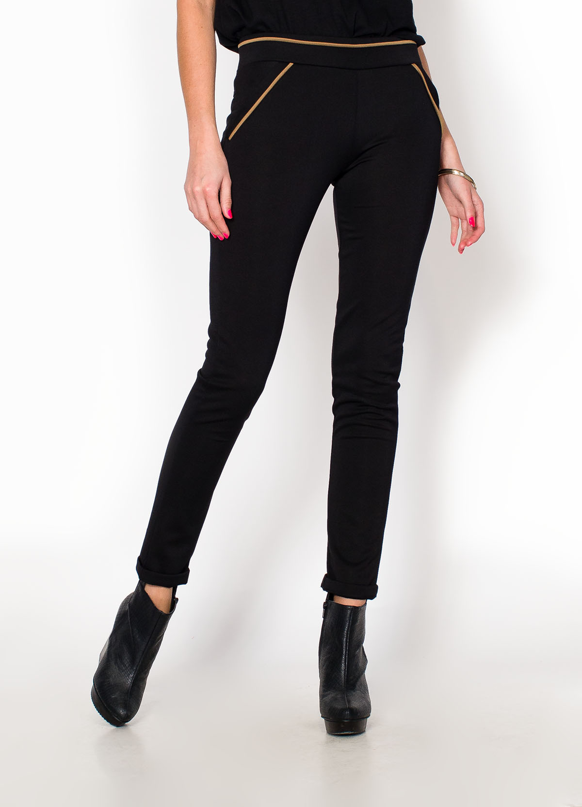 Klasyczne dopasowane rurki z materiału. W kolorze czarnym, z brązowymi lamówkami i wysokim stanem. Wykonane z elastycznego materiału, który świetnie dopasowuje się do ciała. Zapinane na trzy guziki. Wsuwane kieszenie z przodu i na pośladkach.Spodnie posiadają wysoki stan - tak uwielbiany w ostatnim czasie przez światowe gwiazdy, stylistki i blogerki. Eleganckie, komfortowe i bardzo uniwersalne. Bardzo uniwersalne. Klasyczna czerń idealnie łączy się z innymi kolorami. Będą wspaniałą bazą dla wielu oryginalnych zestawień. Doskonale odnajdą się w każdym stylu.Materiał 95% bawełna, 5% lycra.Modelka wzrost 175cm, na co dzień nosi rozmiar S/M