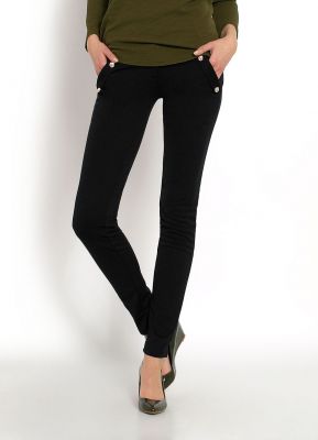Czarne spodnie, zwężana nogawka, kieszenie wsuwane - z przodu z butonami, zapinane na guzik i zamek, z szlufkami.Materiał 65% bawełna, 30% poliester, 5% elastan.Modelka wzrost 175cm, na co dzień nosi S/M, rozmiar z prezentacji produktu M