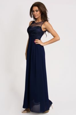 Długa suknia, ozdobiona siateczką, haftem i cekinami