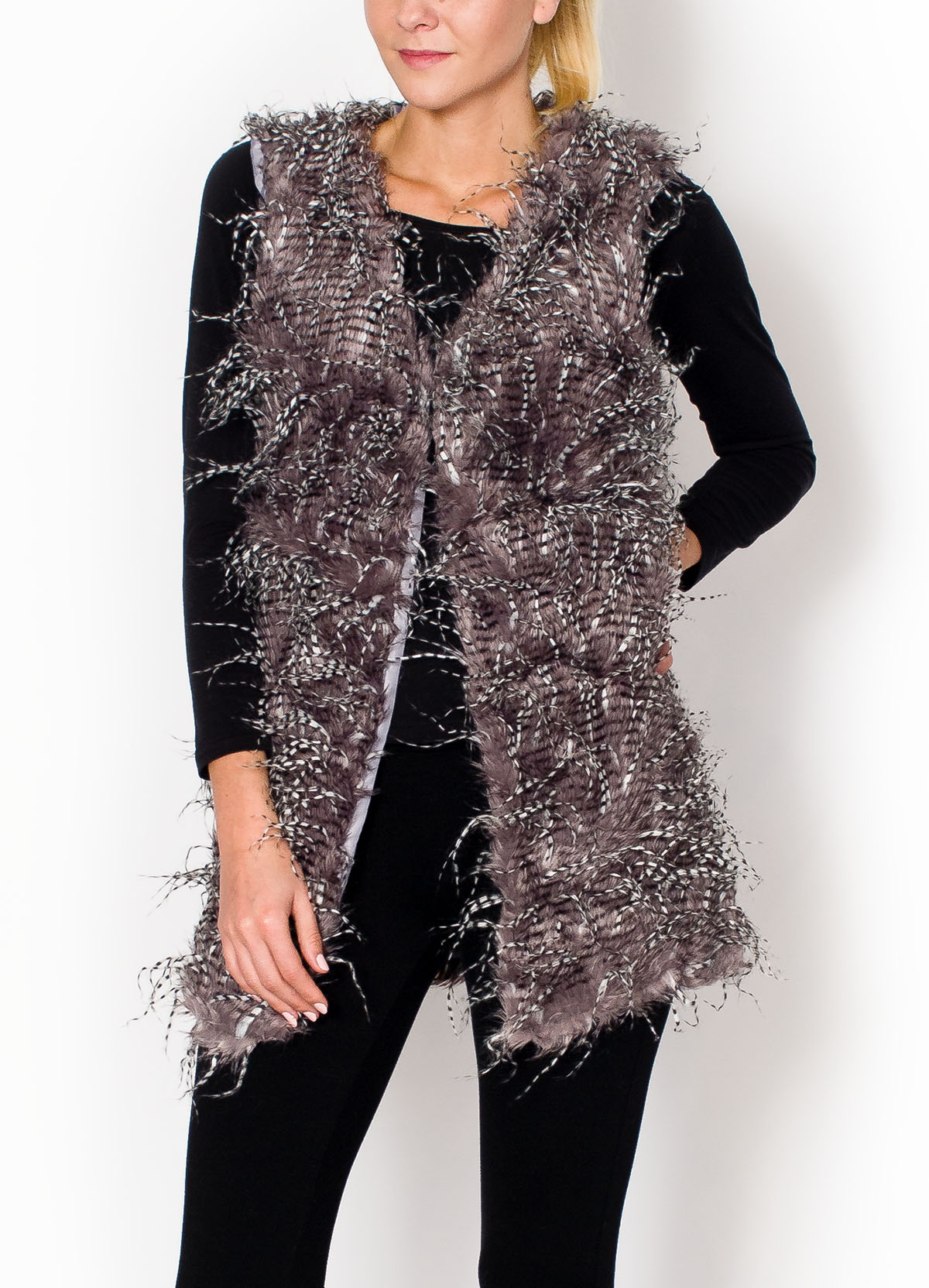 Kamizelka ze sztucznego futerka. Klasyczny, dłuższy fason na podszewce. Zapinana na haftkę. Mięciutkie, dłuższe włosie szczególnie ciekawie prezentuje się podczas ruchu.Futrzane dodatki, to absolutny must have jesiennego sezonu. Przyjemna w dotyku, ciepła i bardzo praktyczna kamizelka doda stylu i przyciągnie spojrzenia. Noszona na sweter, kurtkę, czy płaszczyk nada każdej stylizacji nowoczesnego charakteru. Idealna na chłodne dni, by wyglądać modnie i oryginalnie. Poruszające się włoski, ciekawe wykończenie i zapięcie modelujące sylwetkę zmieniają ten bezrękawnik w niesamowity element stroju zewnętrznego.Materiał 65% poliester, 35% wełna.Modelka wzrost 175cm, na co dzień nosi rozmiar S/M