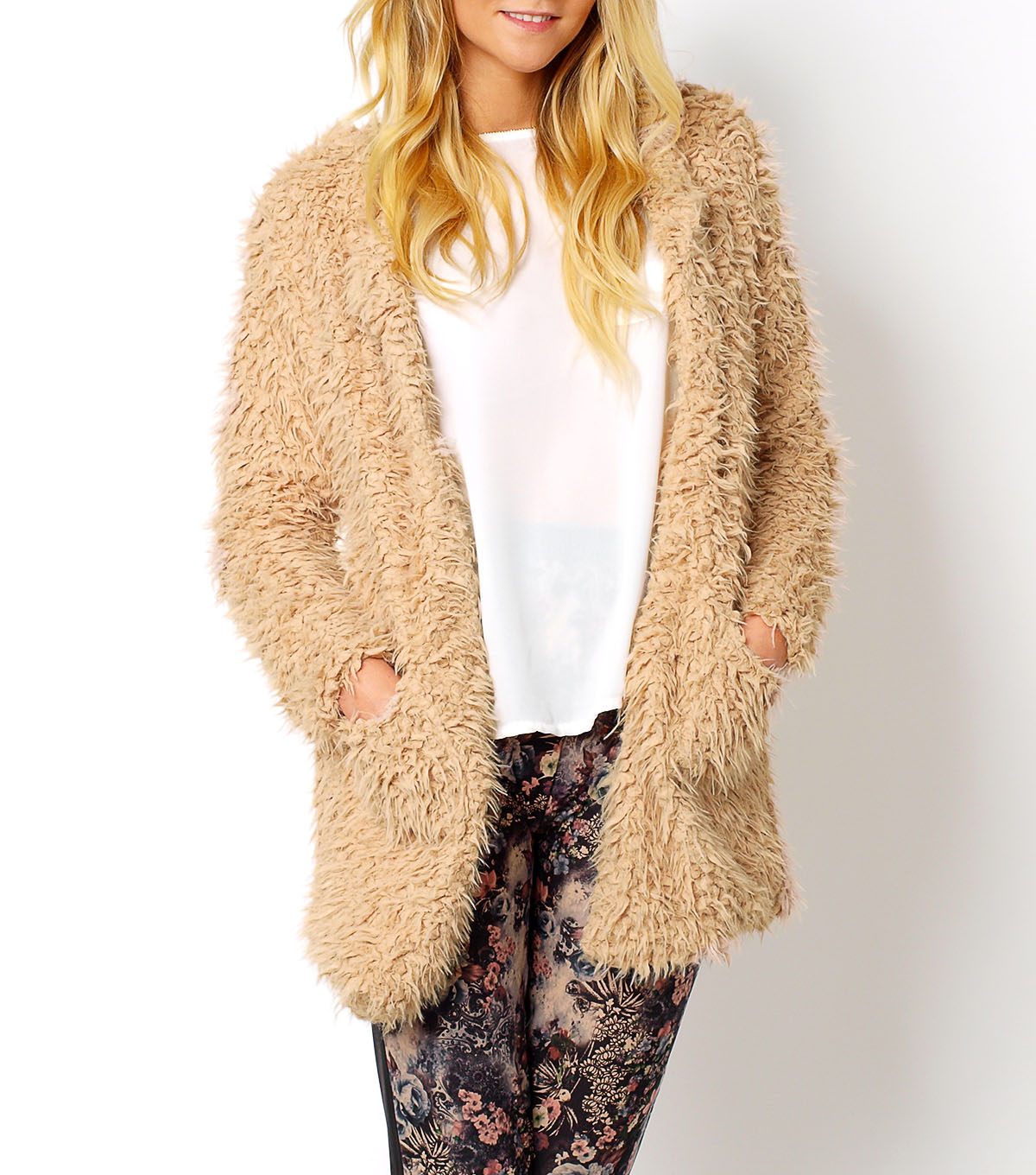 Futrzana narzutka, wewnątrz podszewka, zapinana na haftki, z przodu kieszenie.Materiał 35% wełna, 65% poliester.Modelka wzrost 175cm, na co dzień nosi S/M