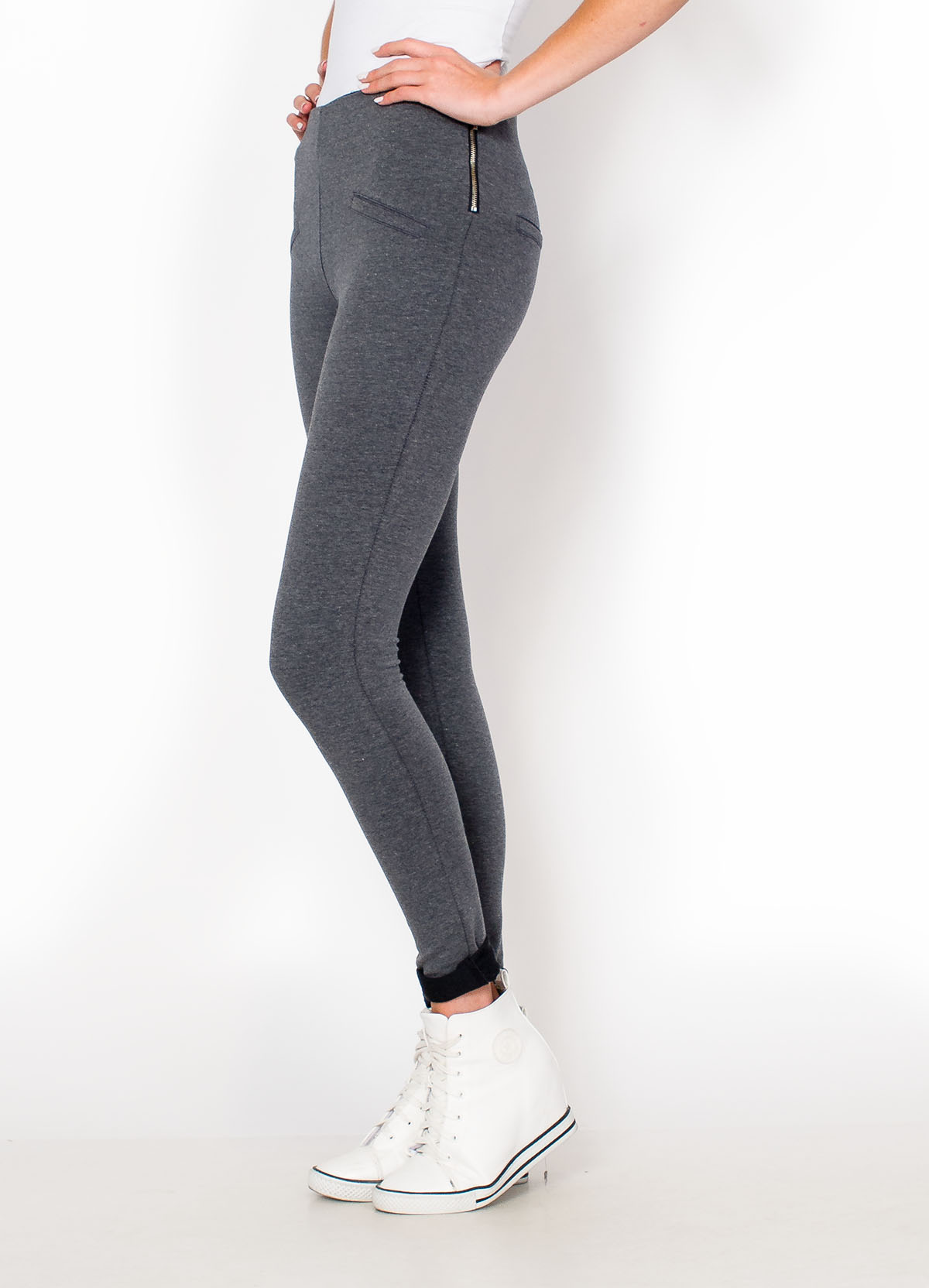 Materiałowe damskie rurki getry na elastycznej gumce w pasie. Dodatkowo z boku na biodrze rozpinany zamek, który stanowi zarówno element ozdobny, jak i ułatwia nakładanie i zdejmowanie spodni. Z przodu i na pośladkach imitacje kieszeni. Przyjemny dla ciała, cieplejszy materiał zapewni komfort podczas noszenia. Klasyczne kolory do wyboru.Getry i legginsy materiałowe to ciekawa i bardzo praktyczna alternatywa dla jeansów i spodni dresowych. Wygodne i bardzo uniwersalne - pasują do wszystkiego. Atrakcyjnie podkreślą figurę. Modelka wzrost 175cm, na co dzień nosi rozmiar S/M
