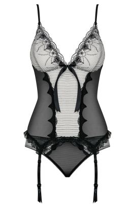 To piękny i zmysłowy komplet uszyty z delikatnego, transparentnego tiulu. Zdobiony wyrafinowanym haftem oraz koronkową falbaną. Do kompletu polecamy psek do pończoch oraz pończochy Greyla.