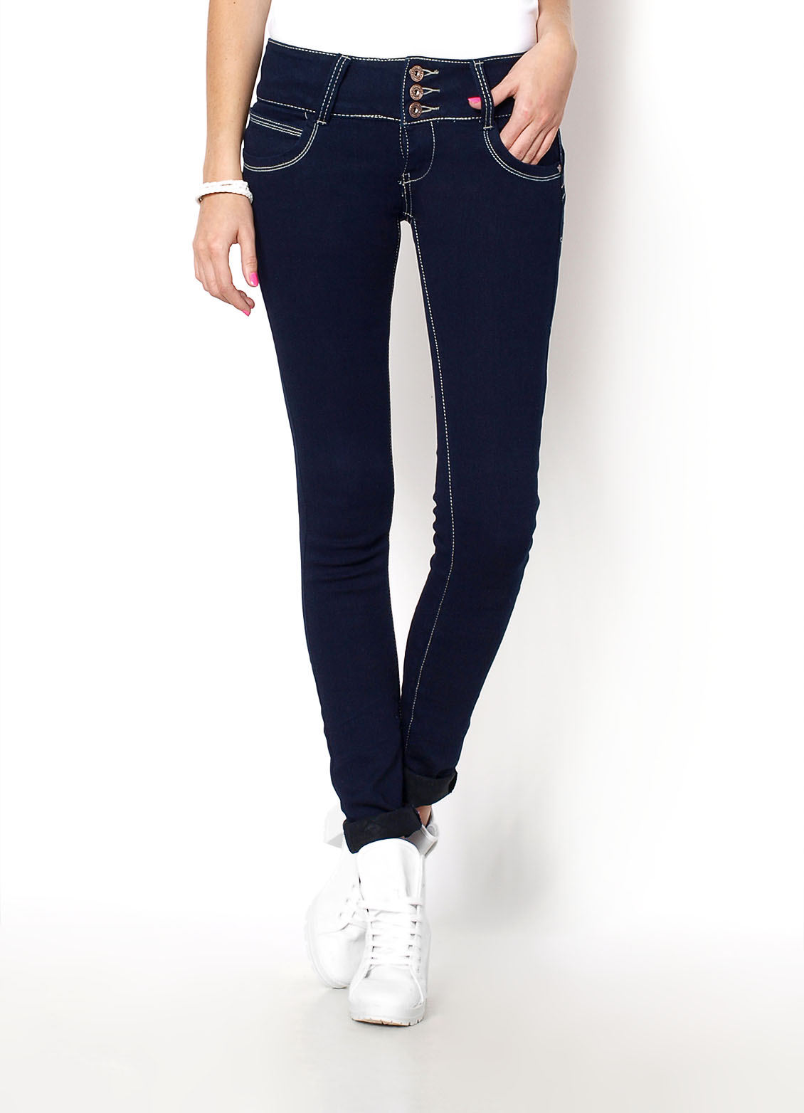 Jeansowe rurki, kolor granat, jednolity model. Spodnie zapinane na zamek oraz 3 guziki. Całość wykończona kontrastową nicią. Kieszenie z przodu oraz z tyłu.Materiał: 70% bawełna, 28% poliester, 2% elastan.Modelka: wzrost 175 cm, na co dzień nosi S/M, rozmiar z prezentacji produktu M.