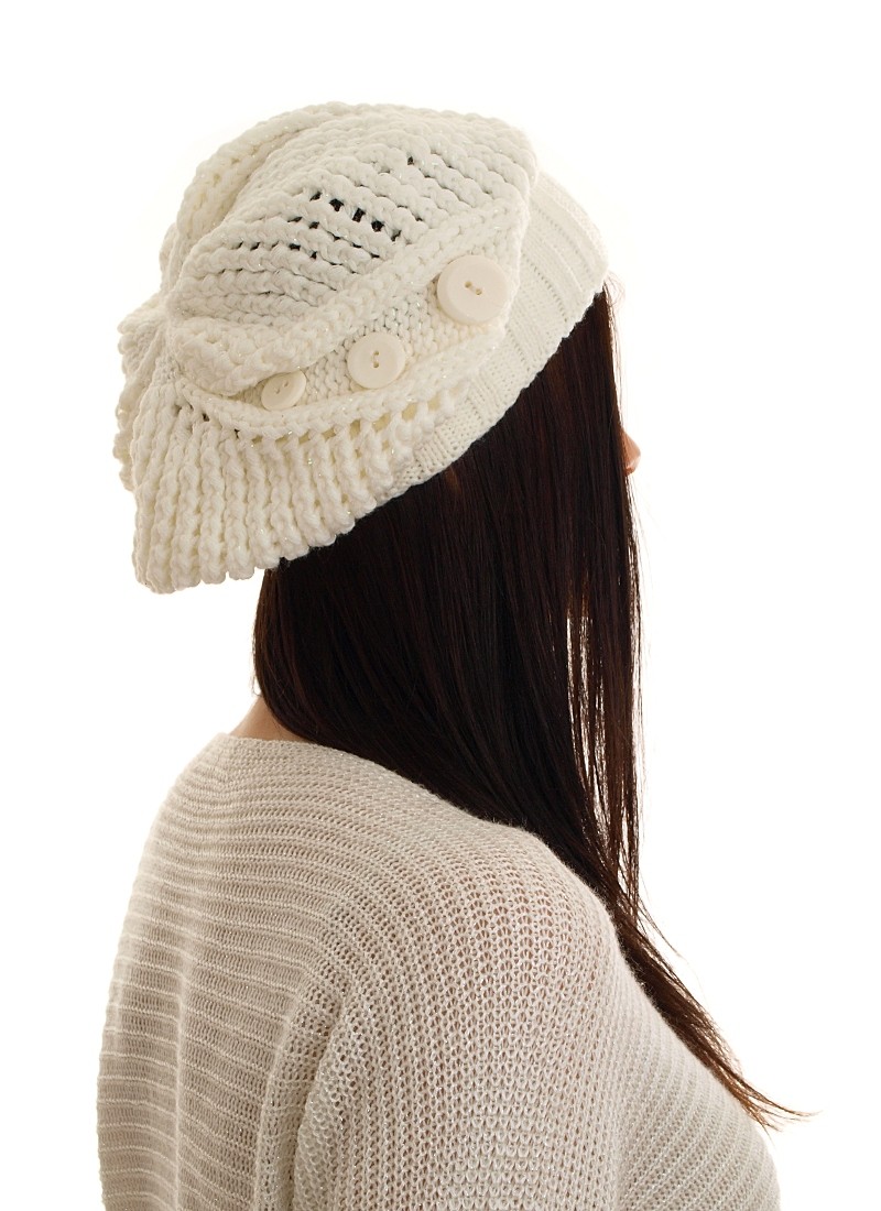 Biała, wyjątkowo ciepła czapka zimowa. Beret z pięknie połyskującą nitką oraz ozdobnymi guzikami. Czapka o ciekawym, wełnianym splocie, łatwa do ułożenia. Przyjemna w dotyku, efektownie uzupełni zimową stylizację. Bardzo modny w tym sezonie fason.Skład: 100% akryl (wełna syntetyczna).
