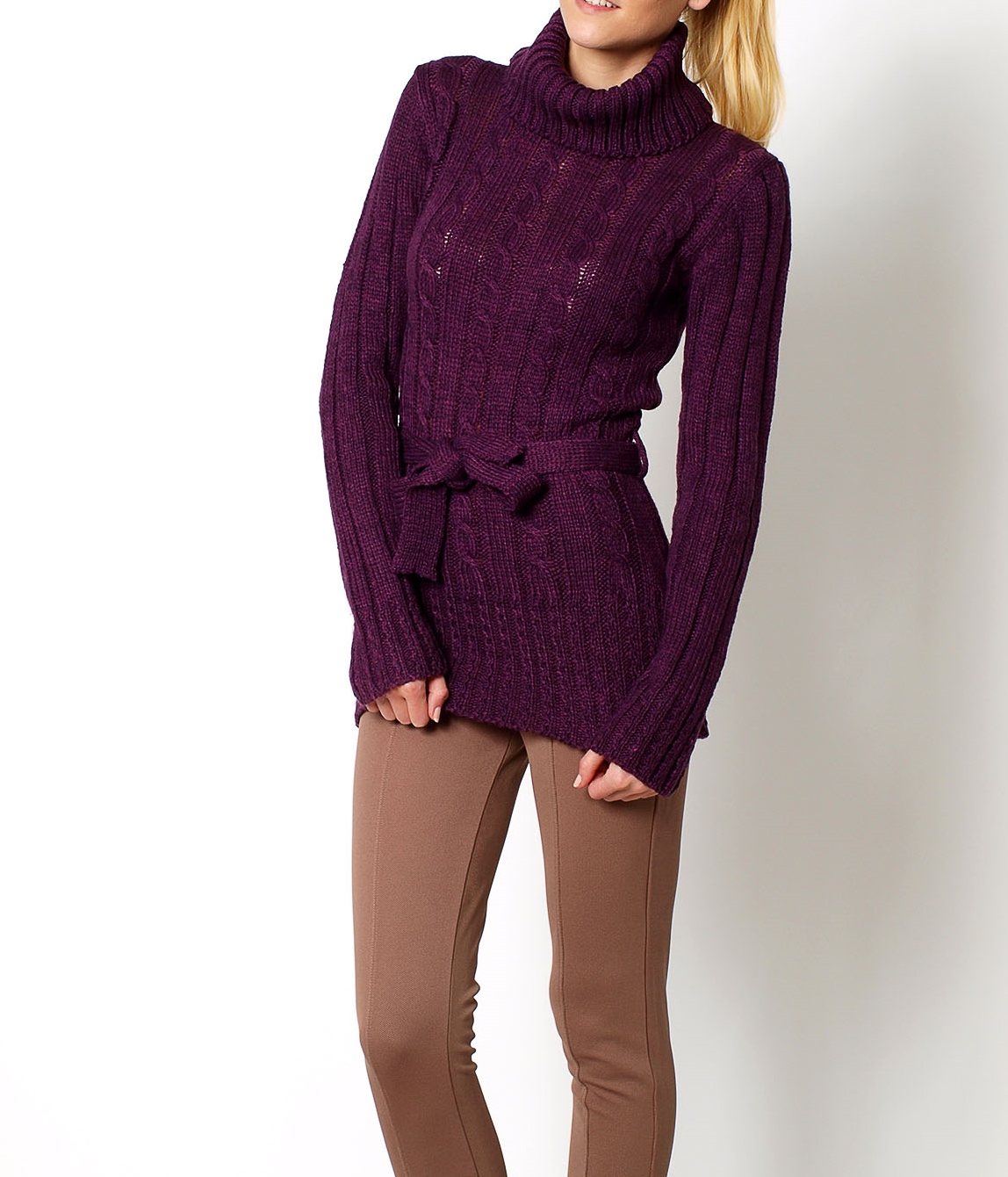 Sweter z golfem, z przodu splot-warkocze, w talii wiązany, dłuższy fason.Modelka wzrost 175cm, na co dzień nosi S/M, rozmiar z prezentacji produktu S/XXL (uniwersalny)