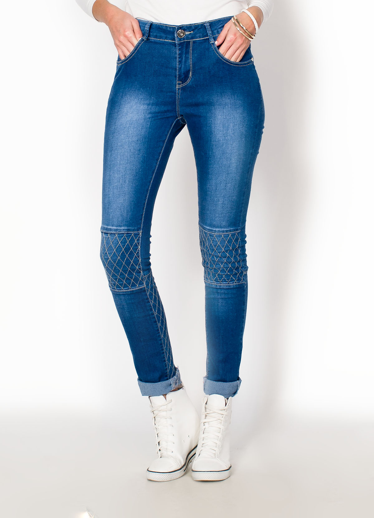 Jeansy rurki damskie z modnymi przeszyciami. Wykonane z dobrej jakości jeansu o przecieranym, jasnym niebieskim odcieniu. Zapinane tradycyjnie na zamek i guzik. W pasie szlufki. Kieszenie z przodu i na pośladkach. Wyższy stan. Pikowanie na nogawkach.Wyjątkowe i modne damskie spodnie z oryginalnymi przeszyciami. Klasyczne niebieskie jeansowe rurki z efektownym pikowaniem dodadzą stylu codziennym stylizacjom. Bardzo wygodne i praktyczne. Materiał 95% bawełna, 5% lycra.Modelka wzrost 175cm, na co dzień nosi rozmiar S/M. Rozmiar prezentowanego produktu M.