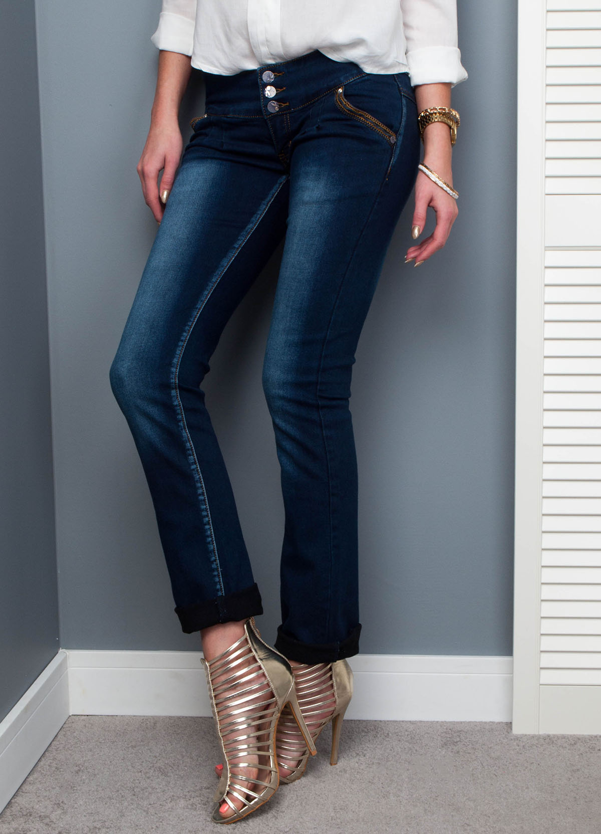 Jeansowe rurki, fason biodrówki, przetarcia na nogawkach, prosta nogawka, w pasie szeroka gumka z motywem kwiatowym, zapinane na trzy guziki oraz zamek, z przodu wsuwane kieszenie, z tyłu imitacje kieszeni, wykończenie jeansów kontrastową nicią. Modelka 78% bawełna, 20% poliester, 2% spandex.Modelka wzrost 175cm, na co dzień nosi S/M, rozmiar z prezentacji produktu 38