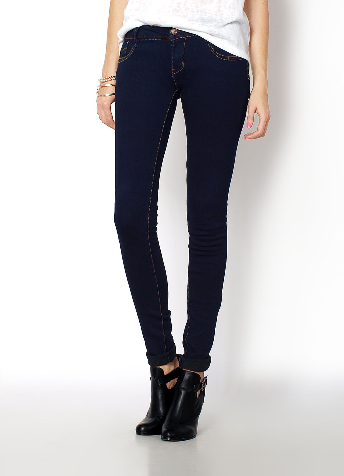 Granatowe jeansy, klasycznie zapinane na suwak oraz guzik. Pas ze szlufkami. Kieszenie z przodu oraz z tyłu. Materiał: 70% bawełna, 25% poliester, 2% elastan.Modelka: wzrost 175 cm, na co dzień nosi S/M, rozmiar z prezentacji produktu S/M.