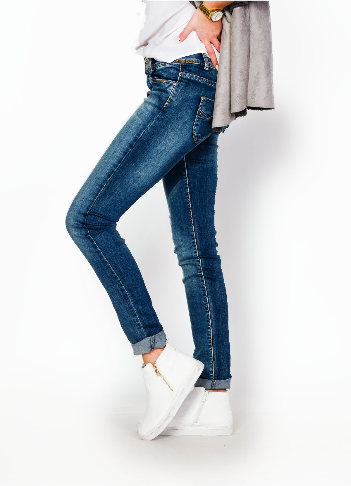 Spodnie jeansowe rozjaśniane na nogawkach. Nogawki zwężane - typowe rurki. Zapinane na zamek i dwa guziki, w pasie szlufki. Wsuwane kieszenie z przodu i z tyłu wykończone nitami. Materiał dobrze dopasowuje się do figury, nogawki można łatwo podwinąć. Spodnie będą pasowały zarówno do sportowego, jak i eleganckiego stylu. Idealne na jesienno - zimową porę. Bardzo wygodne, idealnie prezentują się zarówno ze szpilkami, jak i obuwiem sportowym. Wąskie nogawki i dopasowany stan podkreślą kształt figury. Oryginalny cieniowany kolor, jako alternatywa dla tradycyjnych niebieskich jeansów, dobrze połączy się z innymi kolorami i stylami. Rurki ładnie będą prezentować się również z podgiętymi nogawkami.Materiał 73% bawełna, 23% poliester, 4% elastanModelka wzrost 175cm, na co dzień nosi rozmiar S/M