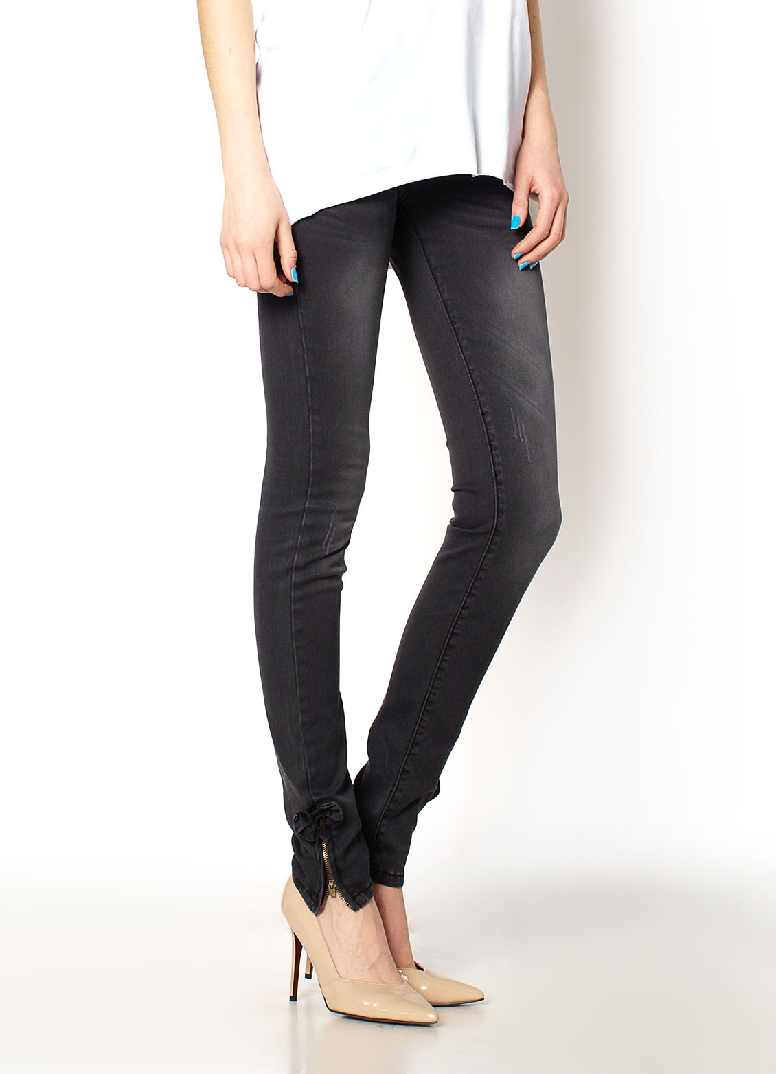 Jeansowe rurki z przetarciami. Nogawki zakończone suwakiem oraz kokardą. Pas ze szlufkami, zapinany na guzik oraz zamek. Na przodzie oraz z tyłu kieszenie. Materiał: 95% bawełna, 5% elastan.Modelka: wzrost 175 cm, na co dzień nosi S/M, rozmiar z prezentacji produktu 38/M.
