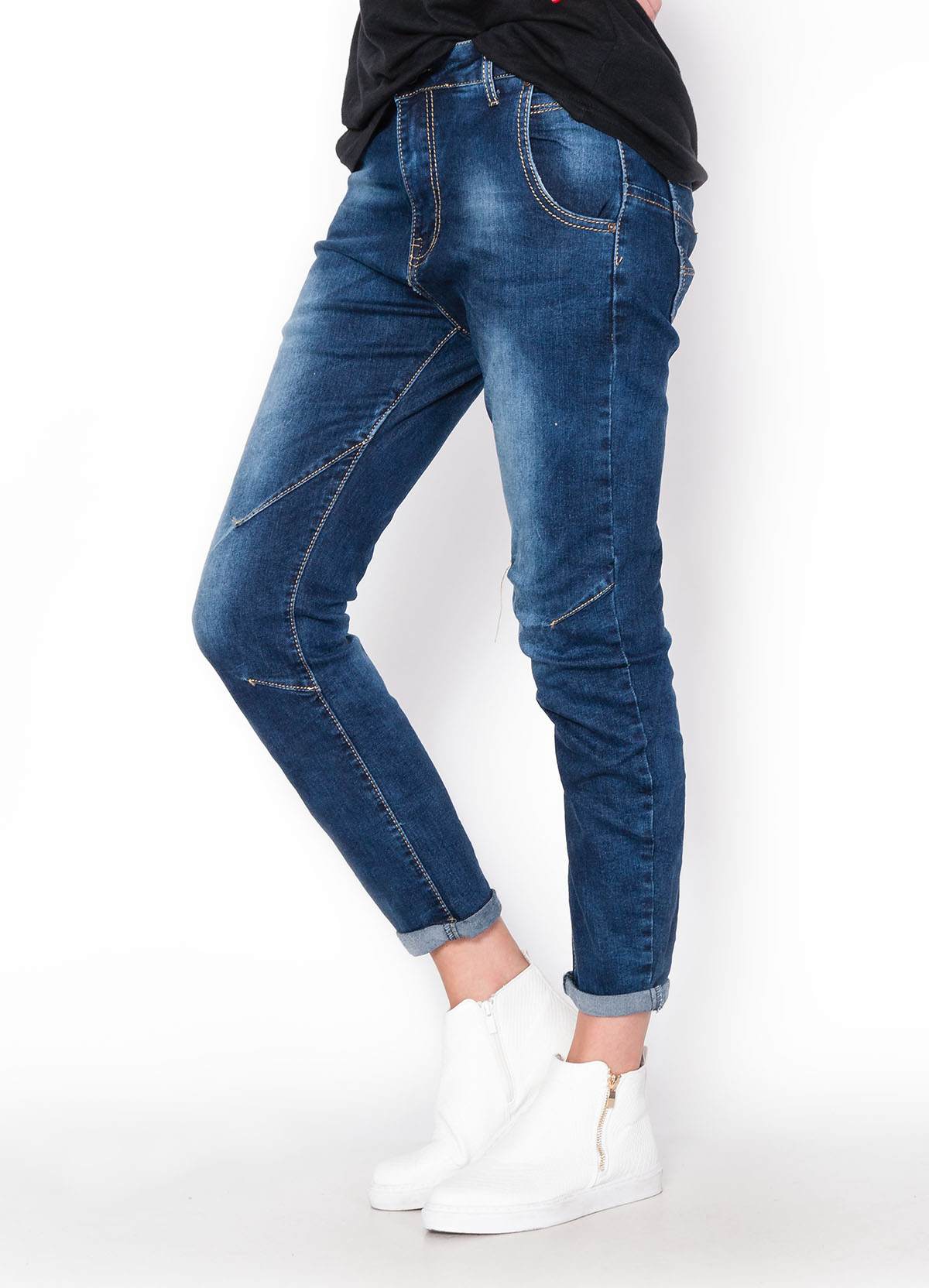 Damskie jeansy rurki typu boyfriend z przeszyciami. Zapinane na guzik i zamek. Kieszenie z przodu i na pośladkach. W pasie szlufki. Obniżony stan. Nogawki zwężane, z możliwością podwinięcia. Na nogawkach przeszycia. Materiał doskonałej jakości, elastyczny, w ciemnym odcieniu przecieranego jeansu.Jeansy typu boyfriendy z obniżonym stanem na swobodny, wyjątkowy codzienny look. Na sylwetce prezentują się wyjątkowo, są wygodne i uniwersalne. Z łatwością dopasują się do dowolnego stylu, z obuwiem sportowym, jak i bardziej kobiecych stylizacji ze szpilkami. Materiał 95% bawełna, 5% elastan.Modelka wzrost 175cm, na co dzień nosi rozmiar S/M