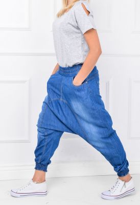 Jeansy damskie typu pumpy / hamerki. Mocno obniżony, szeroki krok, do kolan. Nogawki zakończone ściągaczem - pumpy. Kieszenie z przodu i tyłu z nitami. Gumowany pas ze ściągaczem. Ozdobne diamenciki przy kieszeniach. Materiał doskonałej jakości, dostępne w kolorze jasno-niebieskiego jeansu.Spodnie typu hamerkiz niskim krokiem na sylwetce prezentują się bardzo atrakcyjnie.Pasują do wszystkiego i są komfortowe w noszeniu. Z modnym zestawem dodatków świetnie sprawdzą się w każdej sytuacji - do codziennego stylu casual, stroju sportowego oraz eleganckich outfitów np. ze szpilkami.Materiał 100% bawełna.Modelka wzrost 173cm, na co dzień nosi rozmiar S