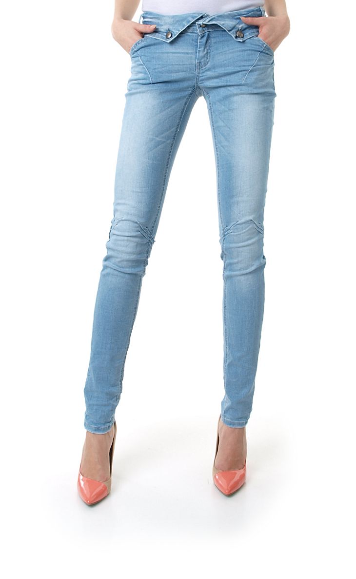 Bardzo modne w tym sezonie jasne jeansy. Spodnie typu rurki z przetarciami. Kieszeniami z przodu, oraz z tyłu wykończone ozdobnymi butonami. W pasie szlufki. Zapinane na zamek oraz guzik. Bardzo wygodne i komfortowe w użytkowaniu.Wykonane z wysokiej jakości jeansu biodrówki. Z przodu efektowne zakładki, które nadają oryginalnego charakteru i wyglądu. Struktura spodni, gnieciona z możliwością wyprasowania, jak w prezentacji produktu. Skład: 97% bawełna, 3% elastan