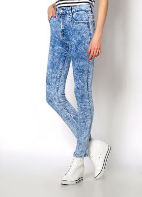 Marmurkowe jeansy z wysokim stanem, zapinane z przodu na zamek i guzik, z przodu i na pośladkach wsuwane kieszenie, w pasie szlufki, nogawki zwężane - rurki.Materiał : 95% bawełna, 5% lycra.Modelka : 175cm, na co dzień nosi S/M, rozmiar z prezentacji produktu 30 (L).