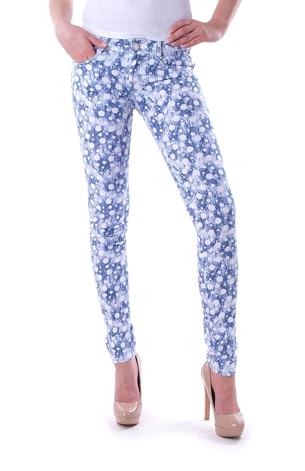 Jeansy / rurki jak legginsy z kieszeniami z przodu i tyłu. Zapinane na zamek i guzik.Możliwa stylizacja z paskiem, gdyż posiadają szlufki. Kolor niebieski ze wzorem typu grochy.Skład: 68% bawełna, 29% poliester, 3% spandex