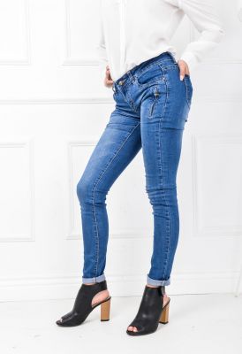 Jeansy damskie typu rurki. Zwężane nogawki. zapinane na guzik i zamek. Kieszenie z przodu i z tyłu z nitami. Na biodrach zamek zakryty zakładką. Gumowane. Dostępne w kolorze ciemnego niebieskiego jeansu.Spodnie są bardzo wygodne, efektowny model w ciekawym odcieniu jeansu, wykonany z najwyższą starannością i dbałością o detale. Przyjemna odmiana od klasycznych jeansów noszonych na co dzień. Pasują zarówno do sportowych zestawień, oryginalnych stylizacji w wersji casual, a nawet do szpilek.Materiał 70% bawełna, 28% poliester, 2% elastyna.Modelka wzrost 173cm, na co dzień nosi rozmiar S.