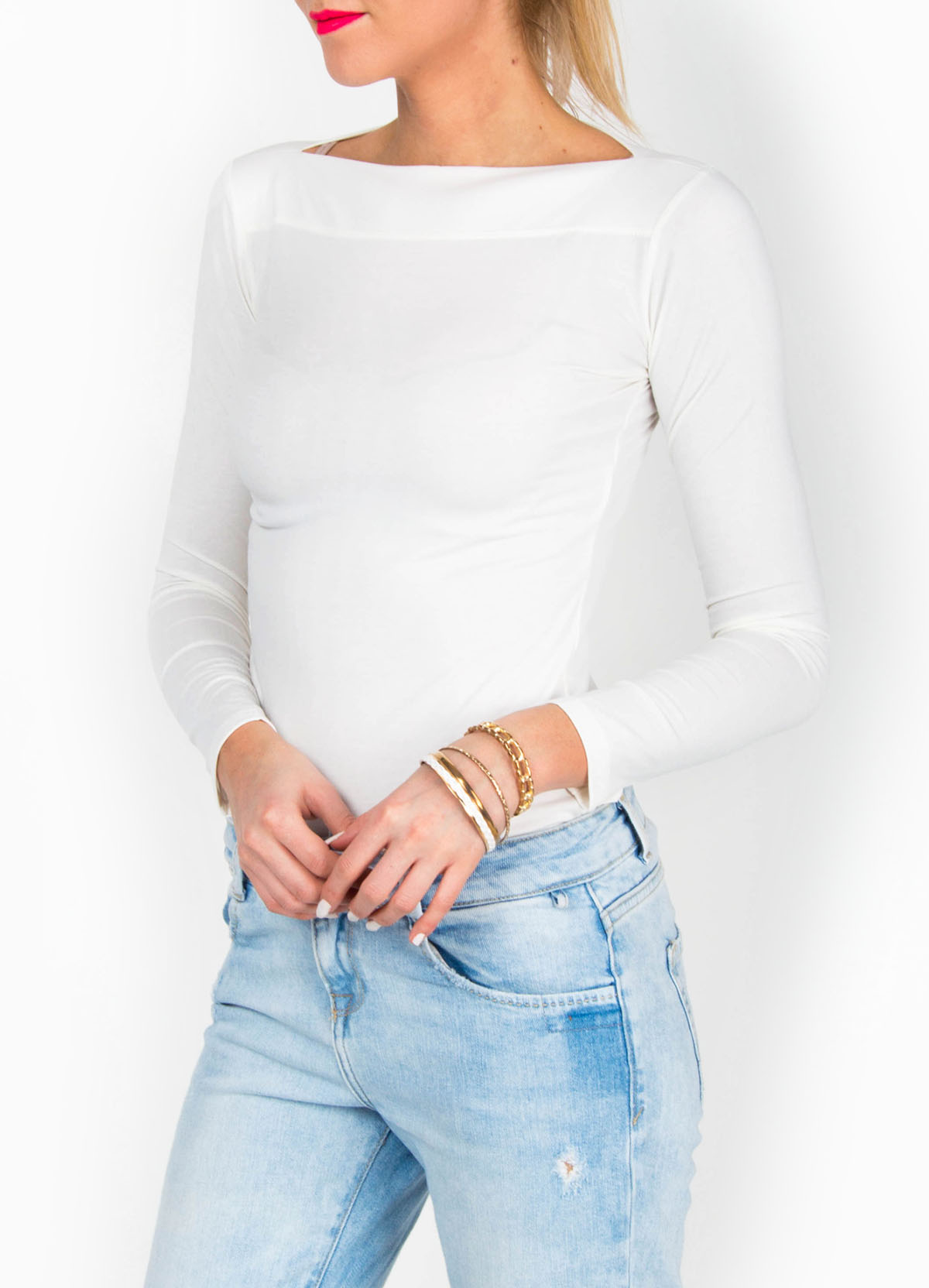 Klasyczna bluzka z długim rękawem. Dekolt łódka. Gładki materiał.Materiał: 95% bawełna, 5% lycra.Modelka: wzrost 175 cm, na co dzień nosi S/M, rozmiar z prezentacji produktu M/L.