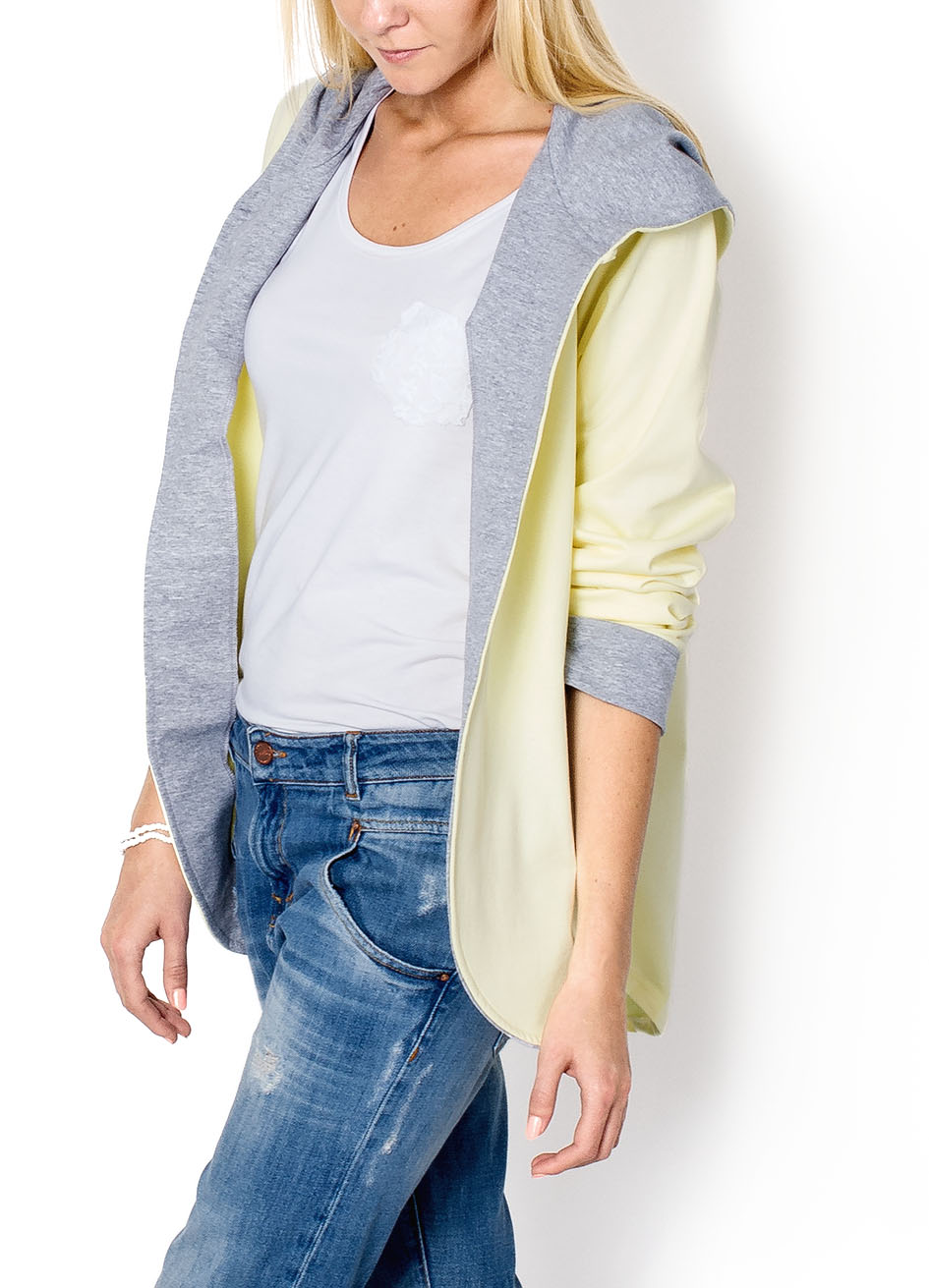 Narzutka z kapturem, luźny, oversizowy krój. Asymetryczna - tył dłuższy od przodu. Długie rękawy, zakończone mankietem.Wygodna, dwukolorowa, z dresowej dzianiny. Produkt turecki - świetnej jakości.Materiał 65% bawełna, 30% poliester, 5% lycraModelka wzrost 175cm, na co dzień nosi rozmiar S/MW zależności od noszonego rozmiaru narzutka będzie luźniejsza, bądź nieco bardziej dopasowana